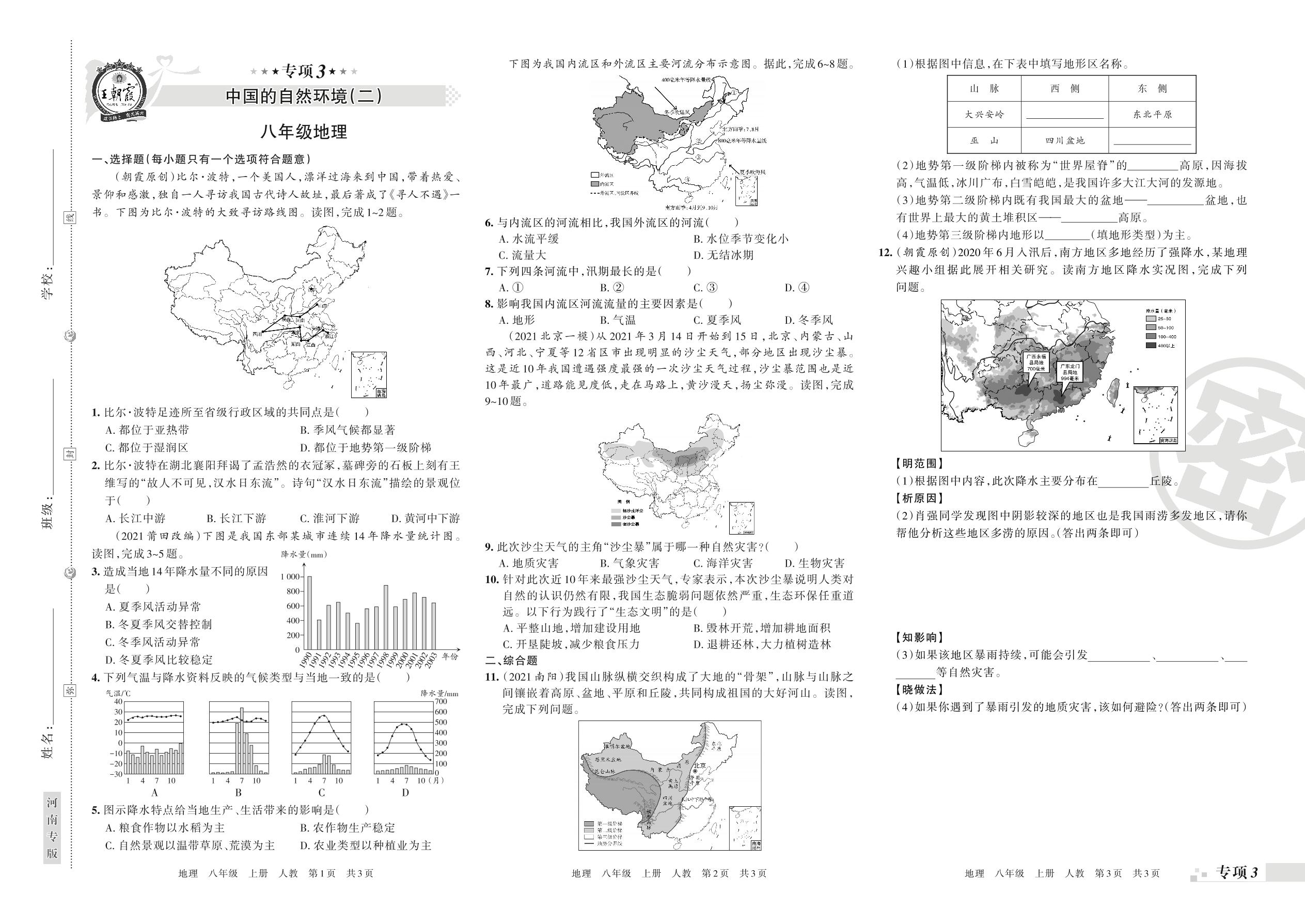 王朝霞期末专项卷——中国的自然环境(二)八年级上册地理(人教版)【3】
