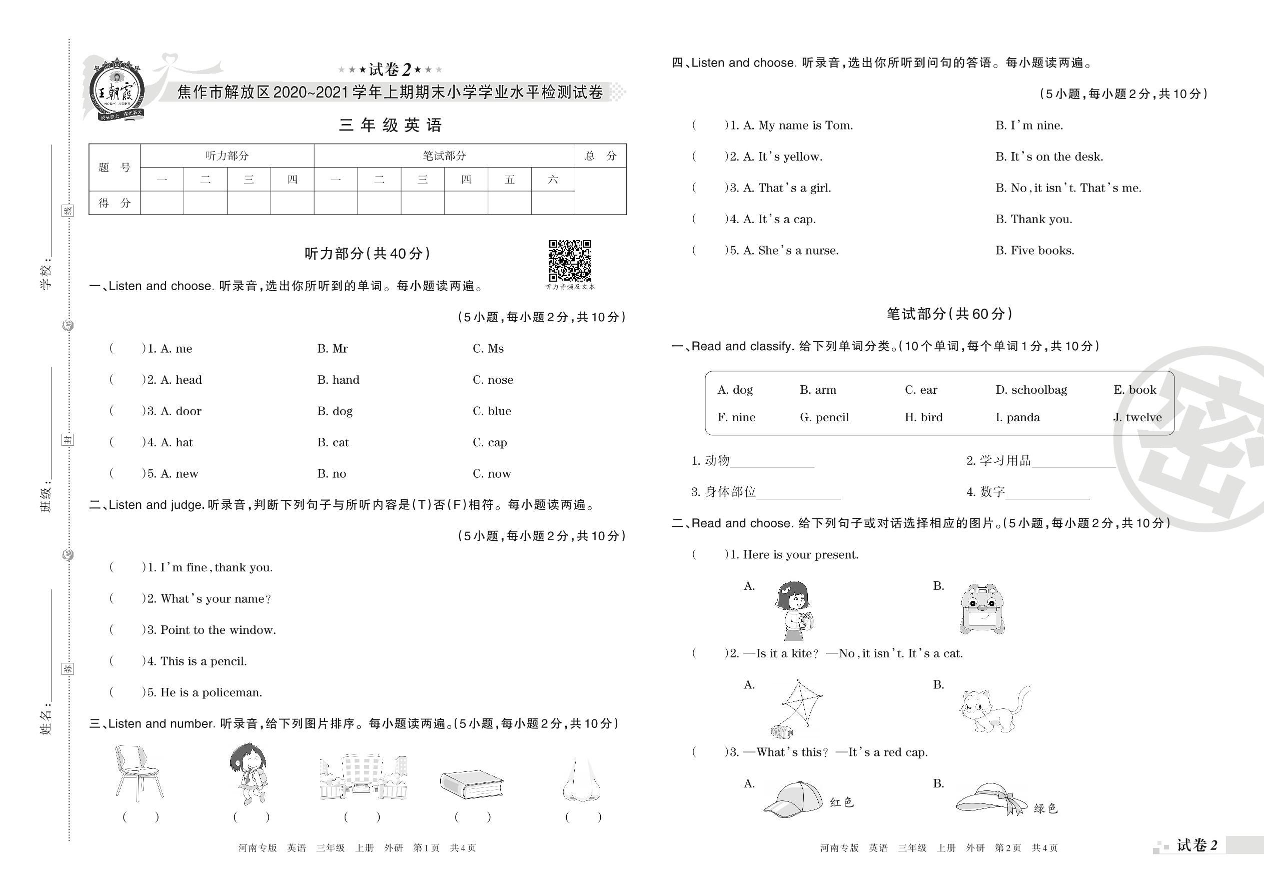 焦作市解放区2020~2021学年上期期末小学学业水平检测试卷三年级英语(外研版)【2】