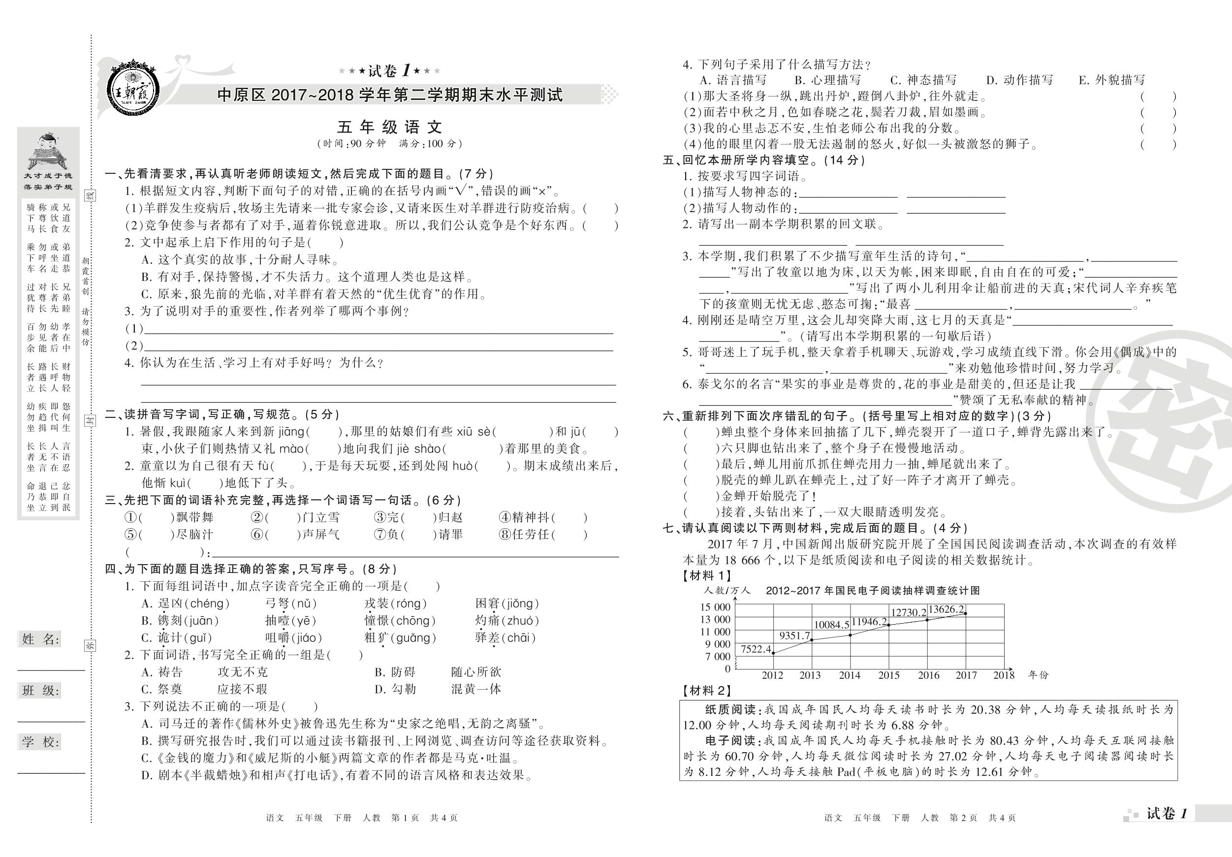 2017-2018学年第二学期郑州市中原区五年级语文试卷(人教版)_R210801204547【1】