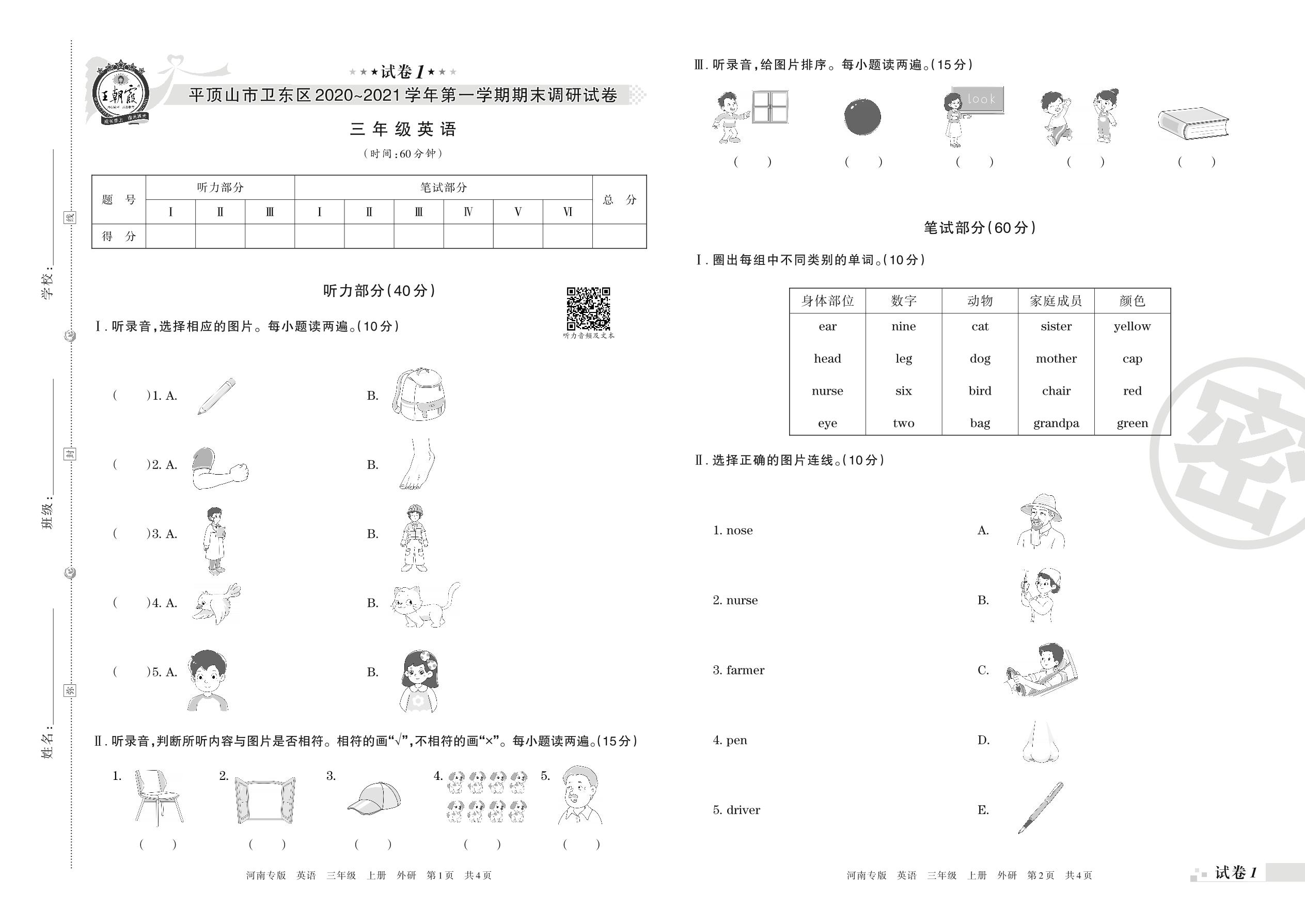 平顶山市卫东区2020~2021学年第一学期期末调研试卷三年级英语(外研版)【1】