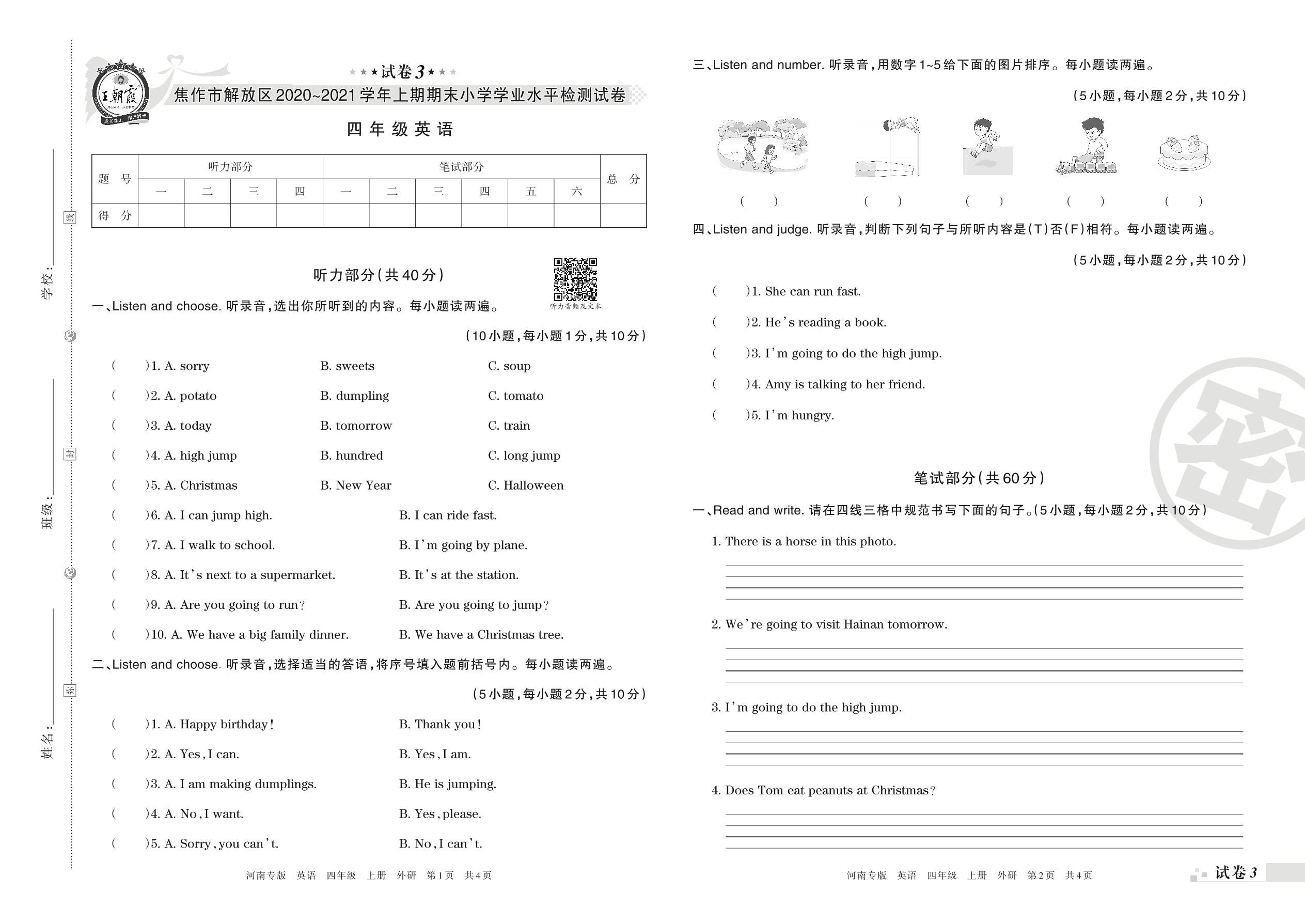 焦作市解放区2020~2021学年上期期末小学学业水平检测试卷四年级英语(外研版)【3】
