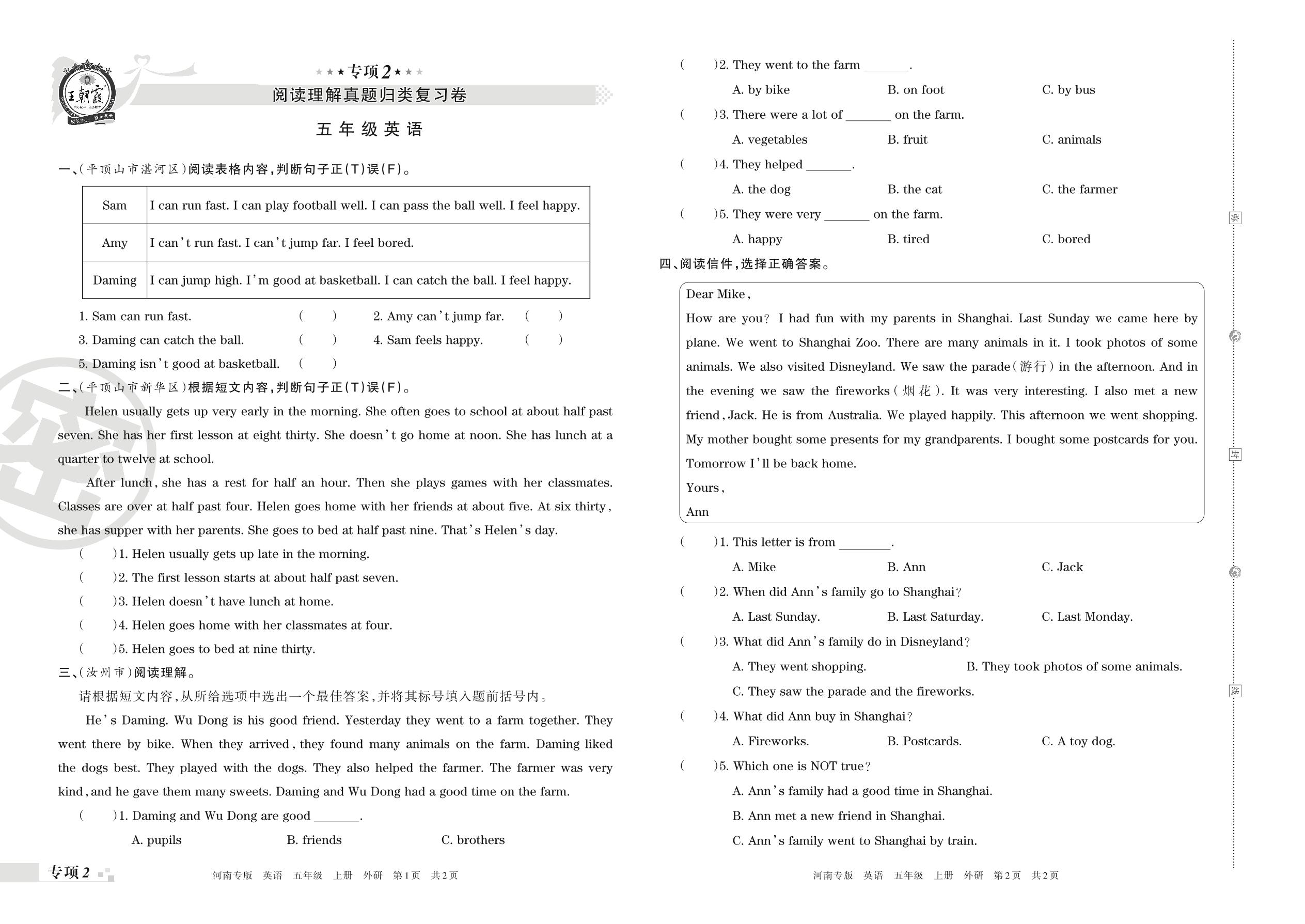王朝霞期末专项卷——阅读理解真题归类复习卷五年级上册英语(外研版)_R211202134855605【2】