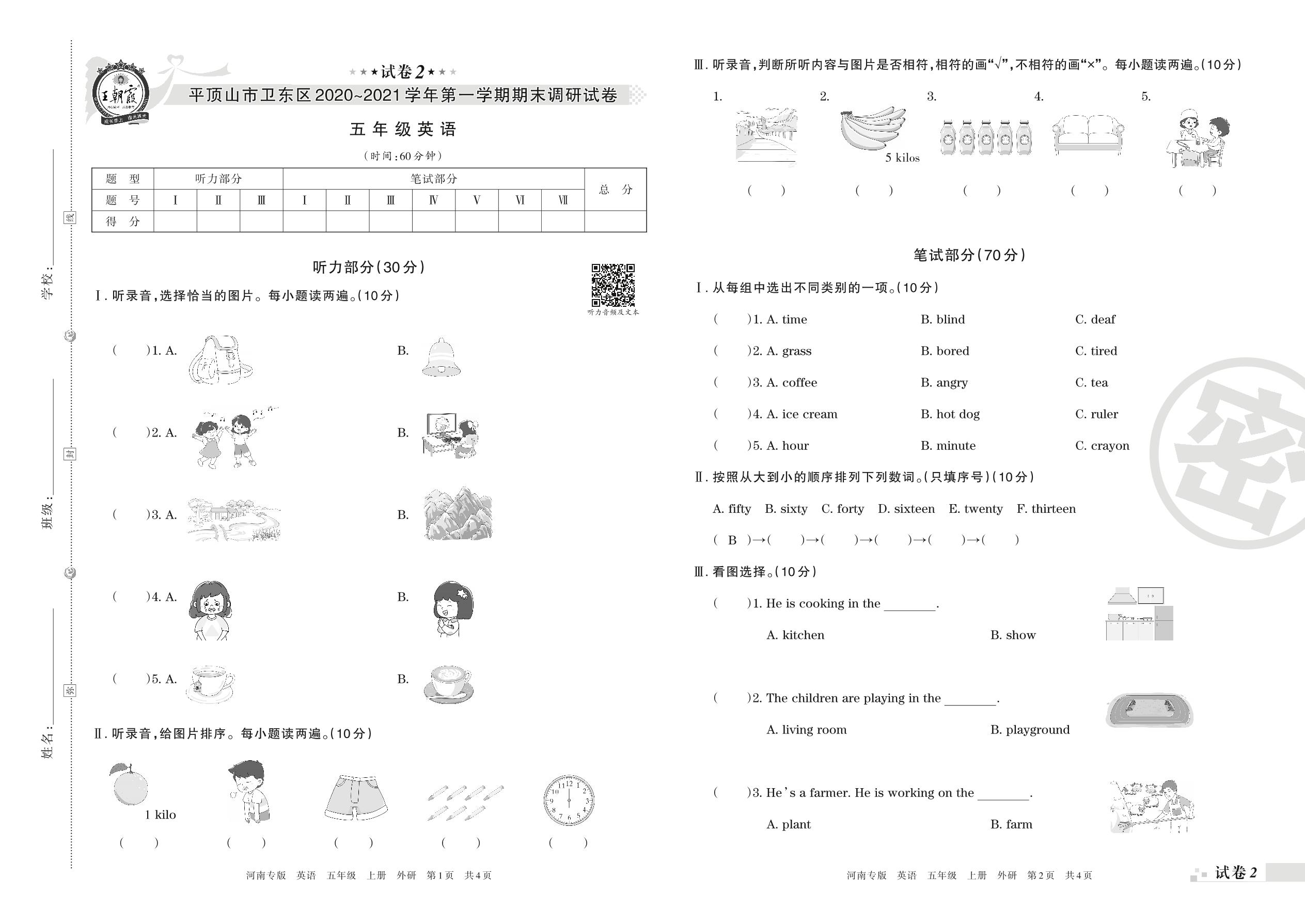 平顶山市卫东区2020~2021学年第一学期期末调研试卷五年级英语(外研版)【2】