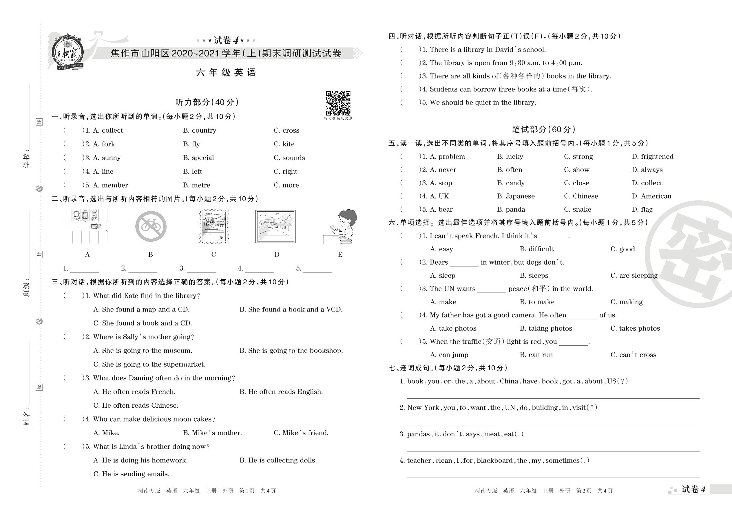 焦作市山阳区2020~2021学年(上)期末调研测试试卷六年级英语(外研版)【4】