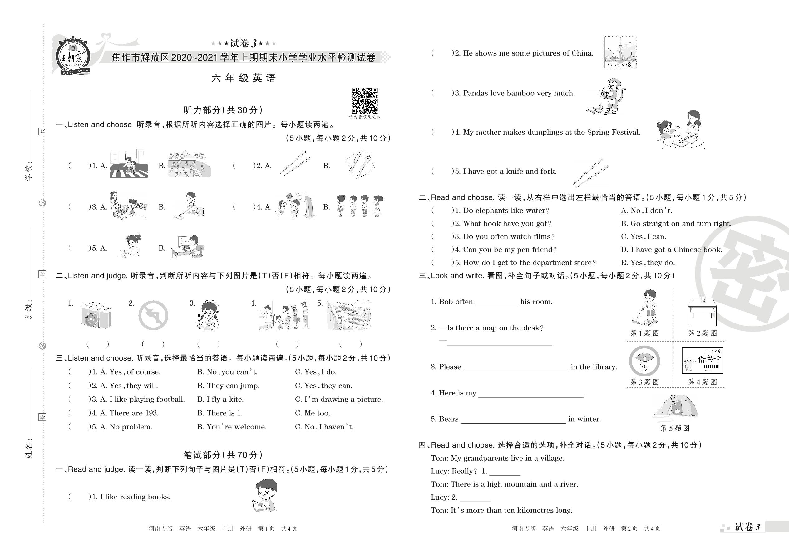 焦作市解放区2020~2021学年上期期末小学学业水平检测试卷六年级英语(外研版)【3】