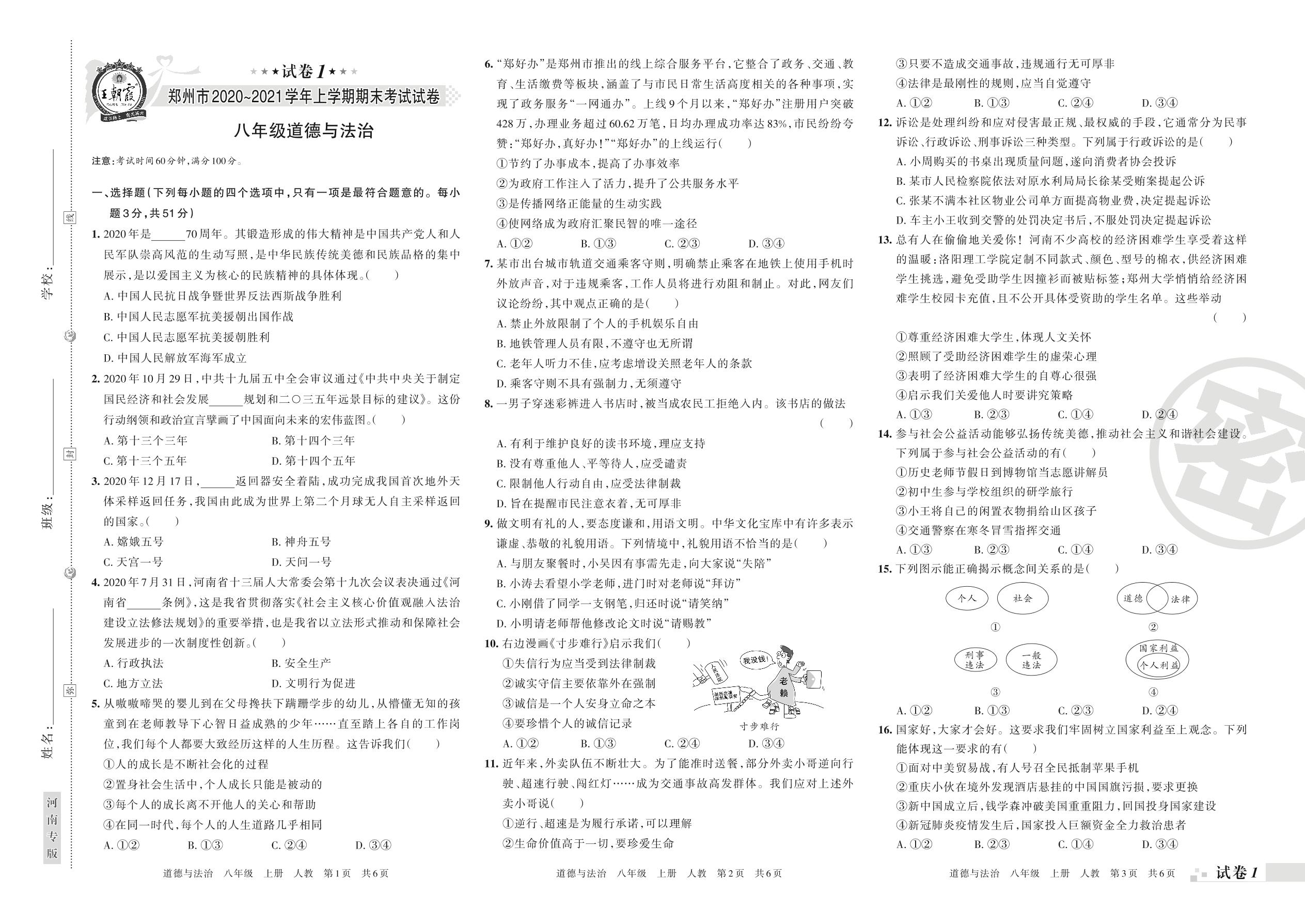 郑州市2020~2021学年上学期期末考试试卷八年级道德与法治(人教版)【1】