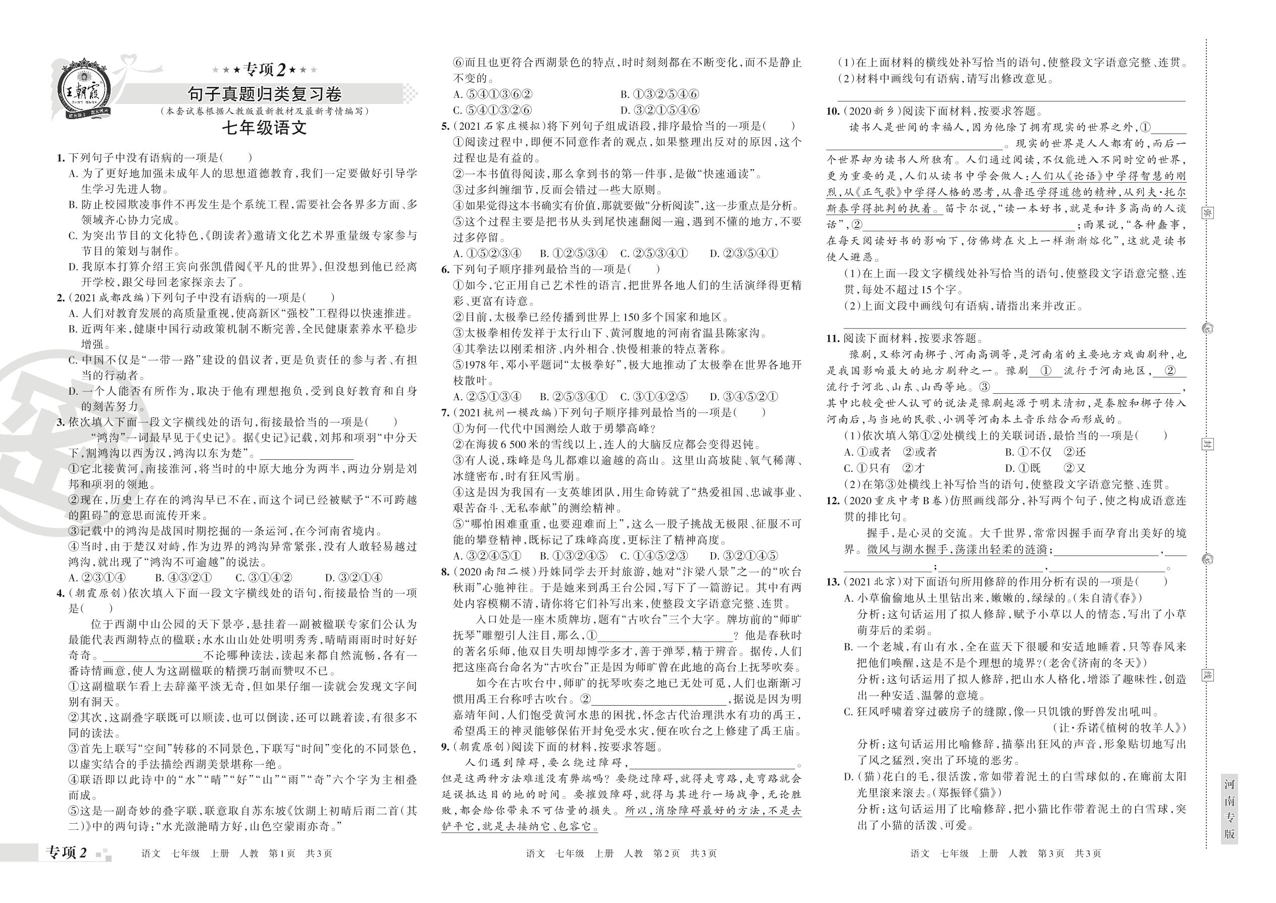 王朝霞期末专项卷——句子真题归类复习卷七年级上册语文(人教版)_R211203140148169【2】