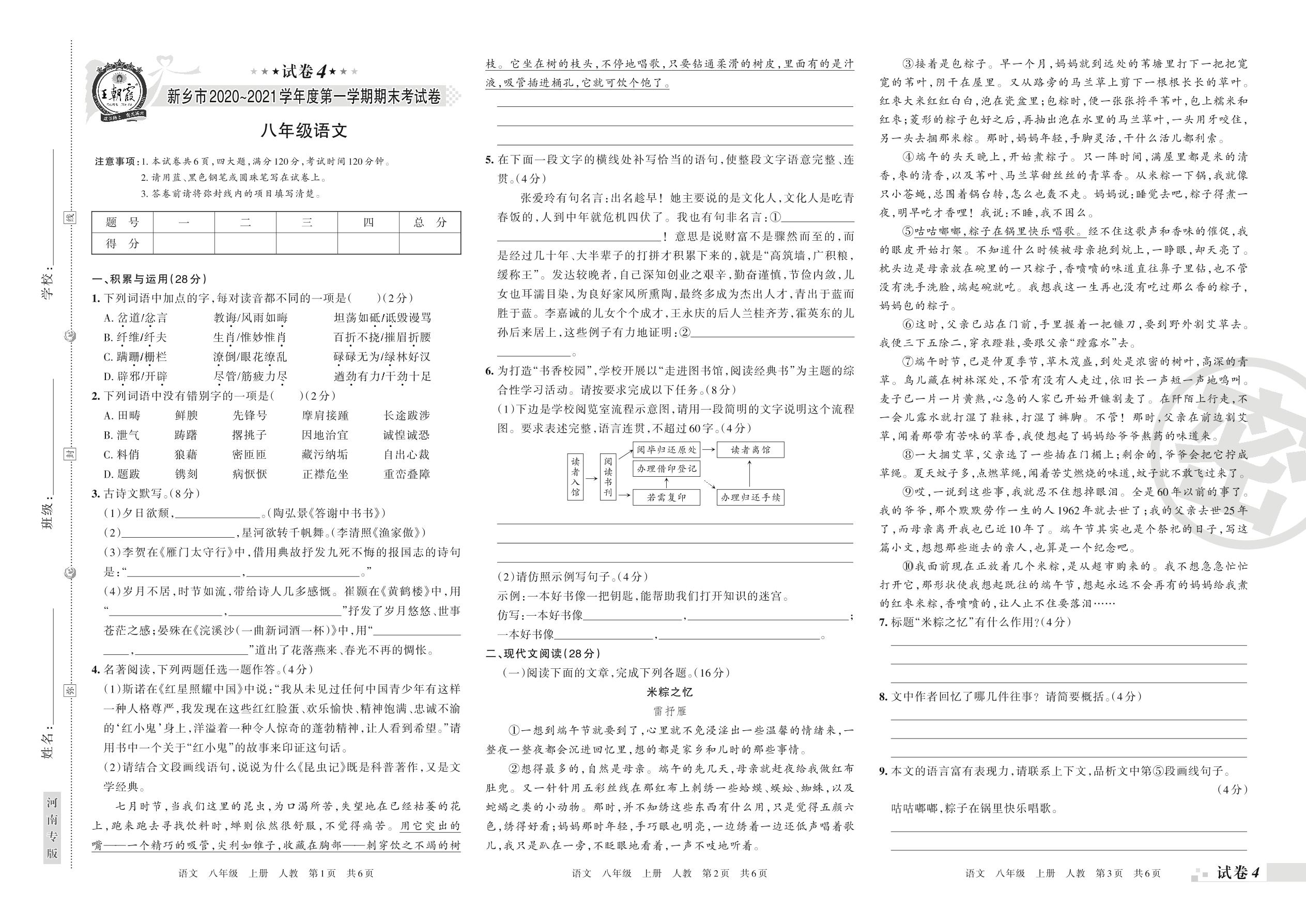 新乡市2020~2021学年度第一学期期末考试卷八年级语文(人教版)【4】