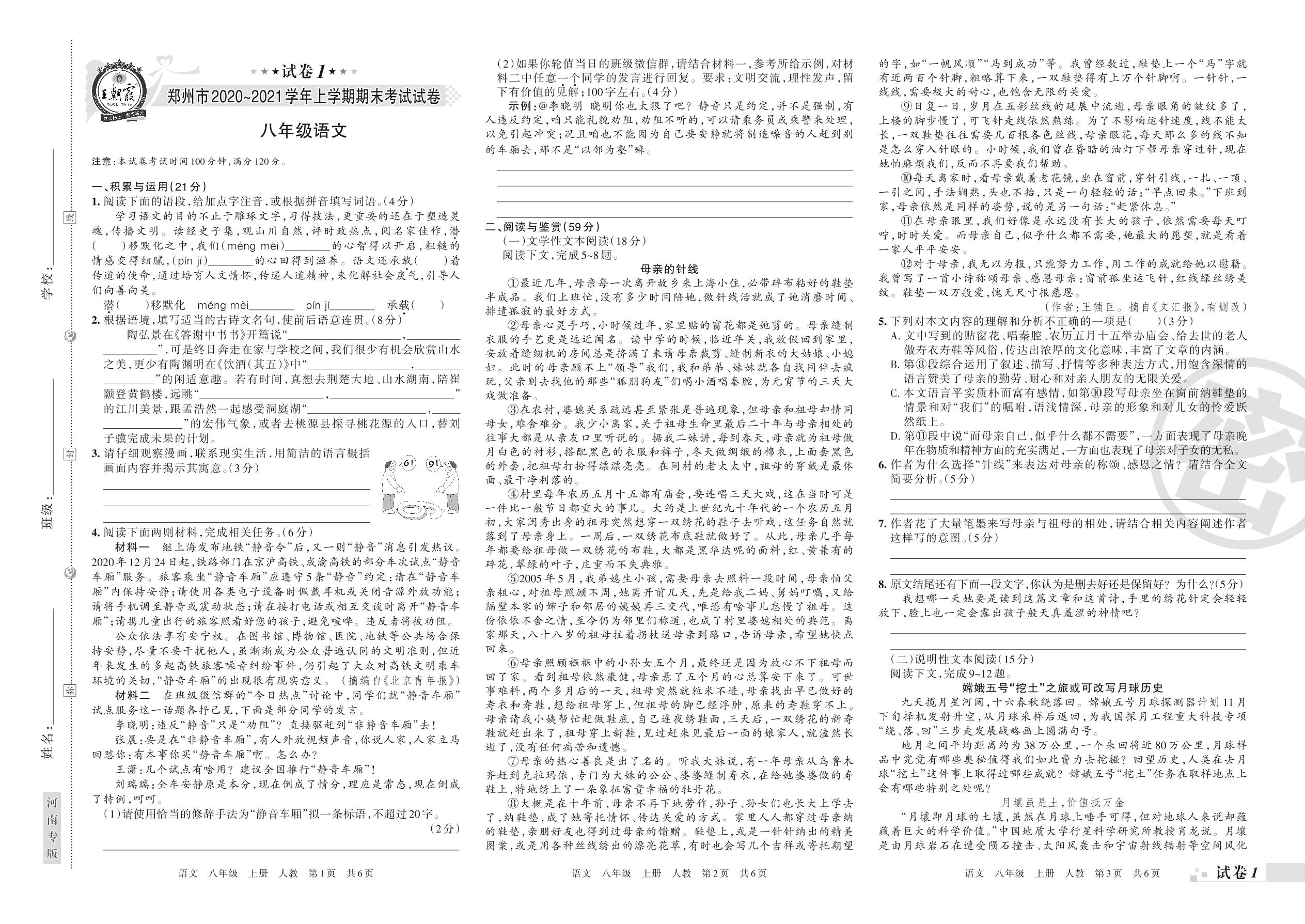 郑州市2020~2021学年上学期期末考试试卷八年级语文(人教版)_R211203141243639【1】