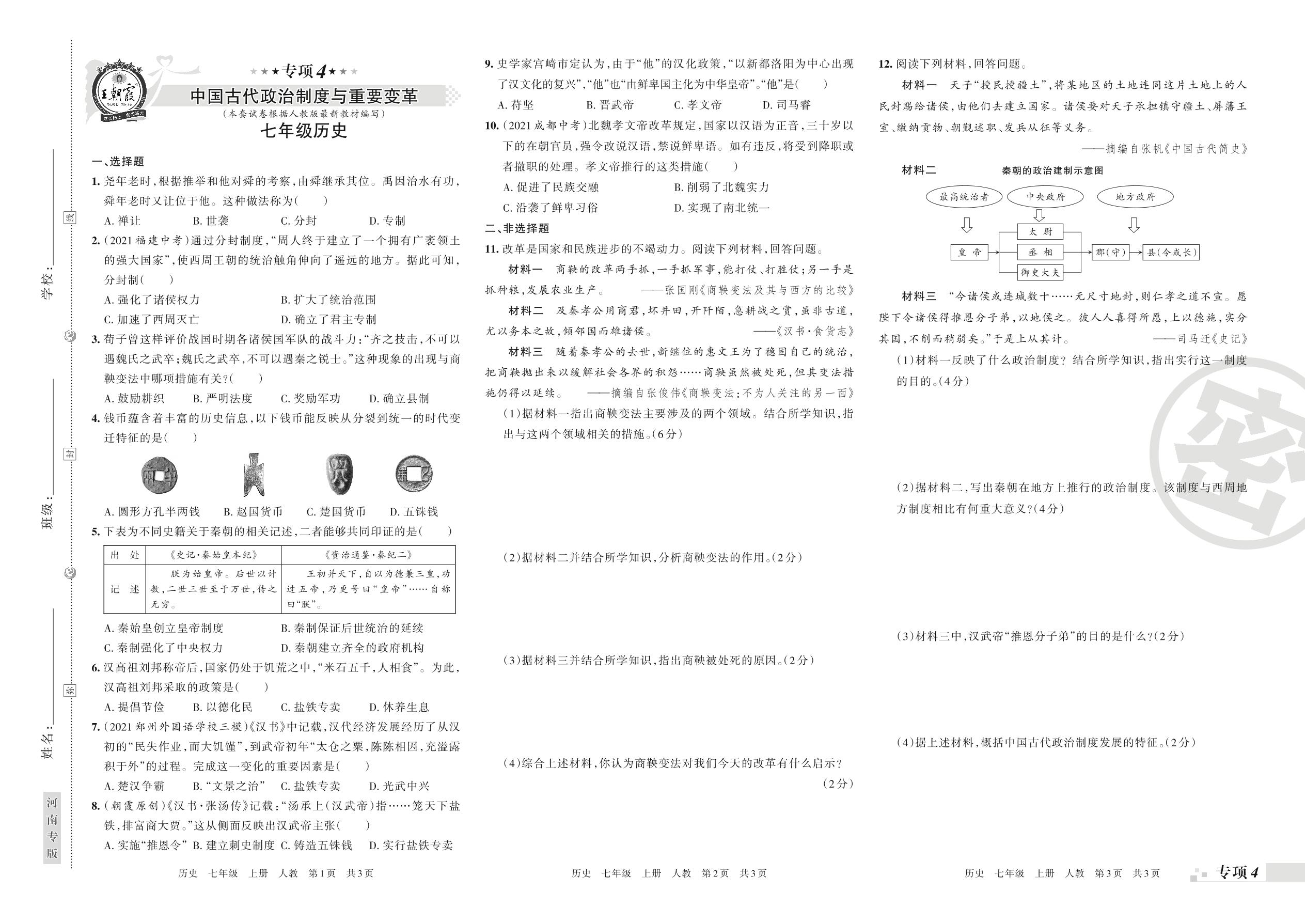 王朝霞期末专项卷——中国古代政治制度与重要变革七年级上册历史(人教版)【4】