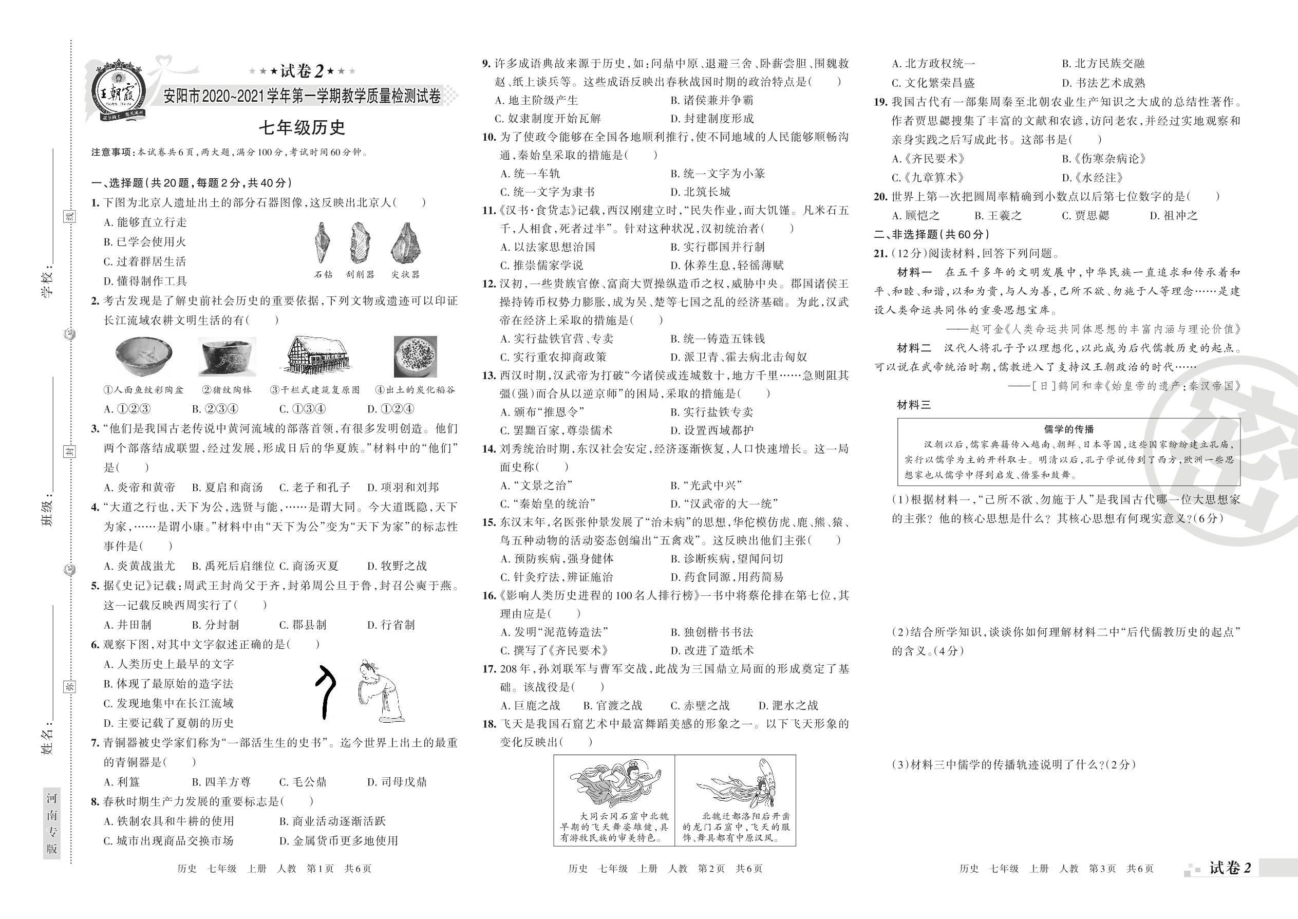 安阳市2020~2021学年第一学期教学质量检测试卷七年级历史(人教版)【2】