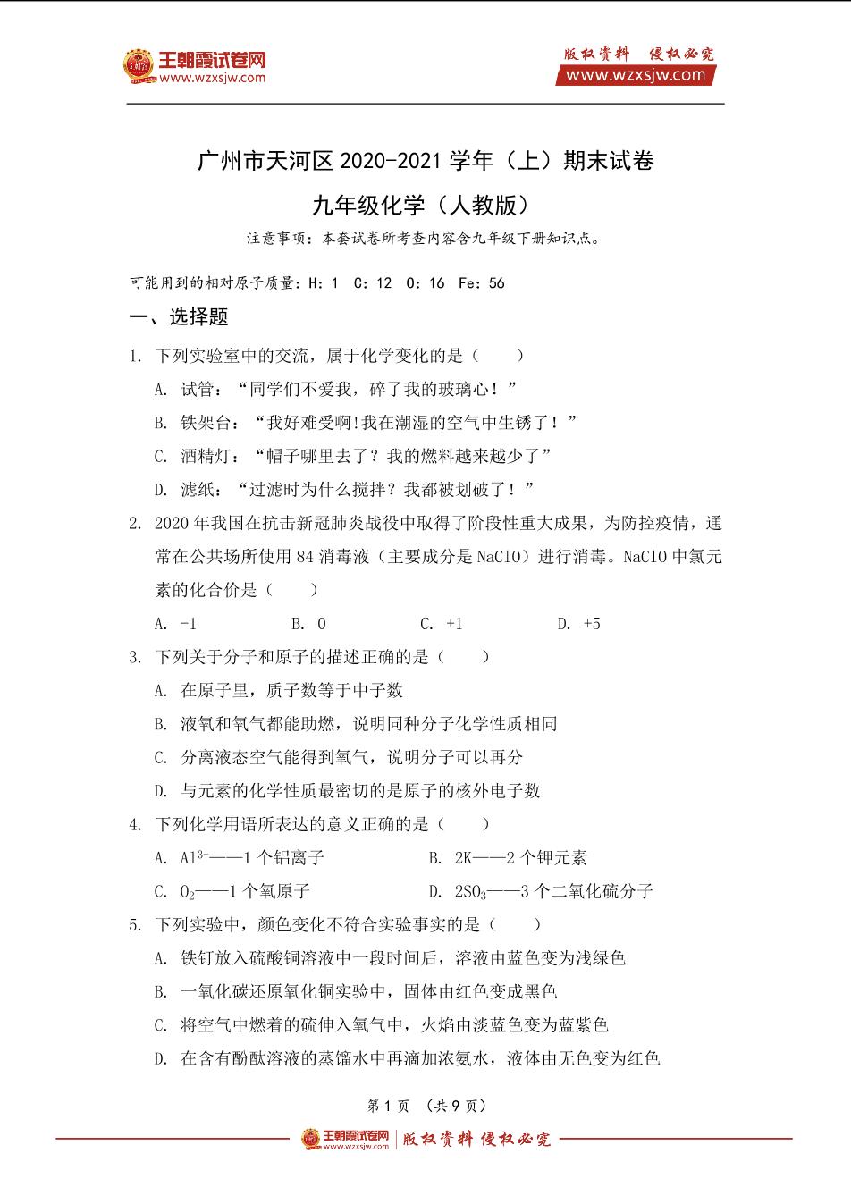 广州市天河区2020-2021学年(上)九年级化学期末试卷(人教版)