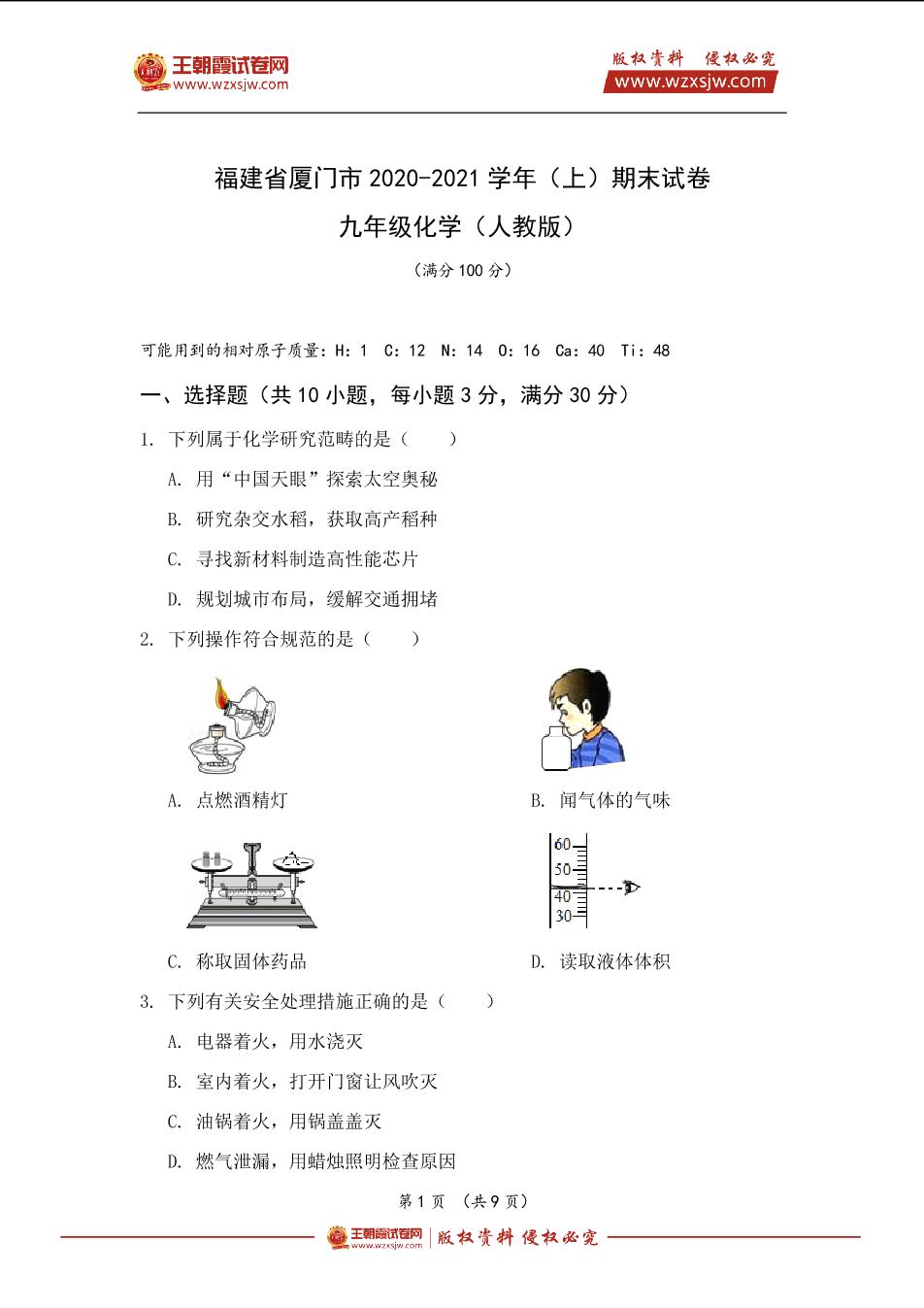 福建省厦门市2020-2021学年(上)九年级化学期末试卷(人教版)