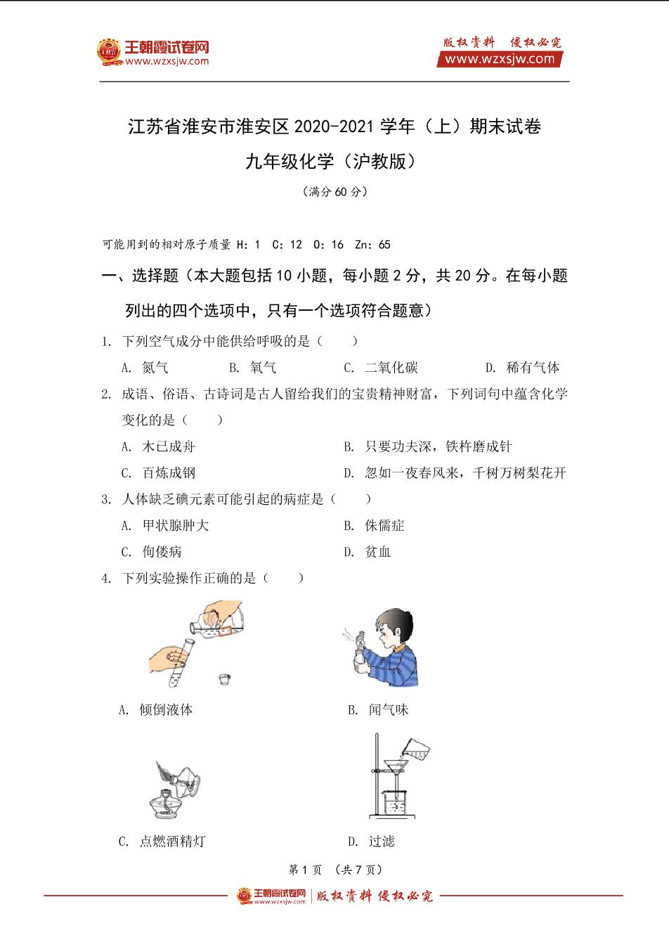 江苏省淮安市淮安区2020-2021学年九年级化学(上)期末试卷(沪教版)