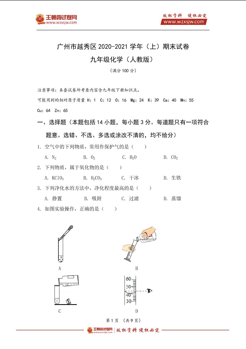 广州市越秀区2020-2021学年(上)九年级化学期末试卷(人教版)