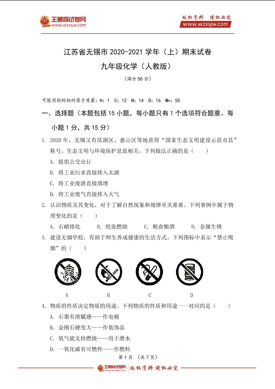 江苏省无锡市2020-2021学年(上)九年级化学期末试卷(人教版)