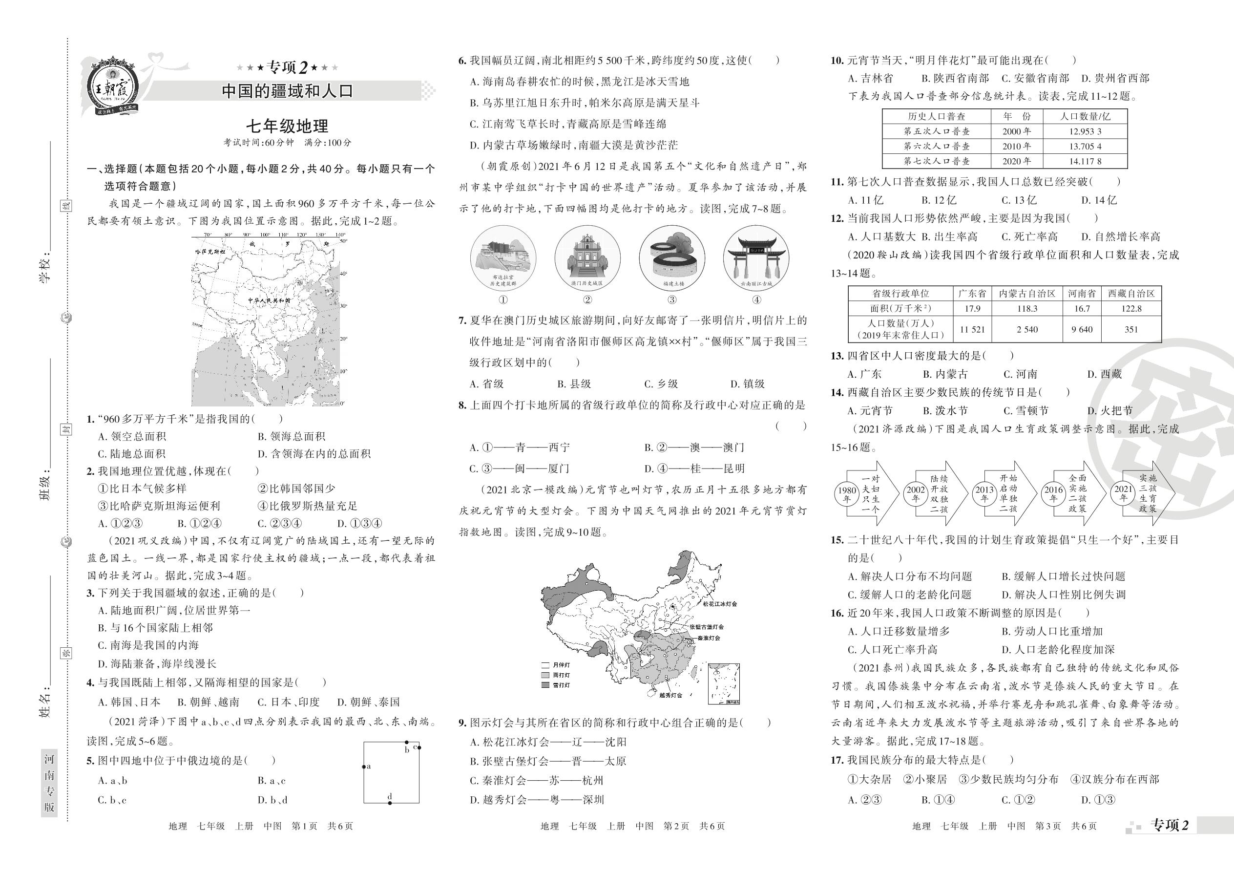 王朝霞期末专项卷——中国的疆域和人口七年级上册地理(中图版)【2】