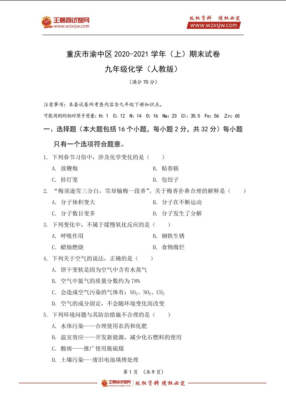 重庆市渝中区2020-2021学年(上)九年级化学期末试卷(人教版)