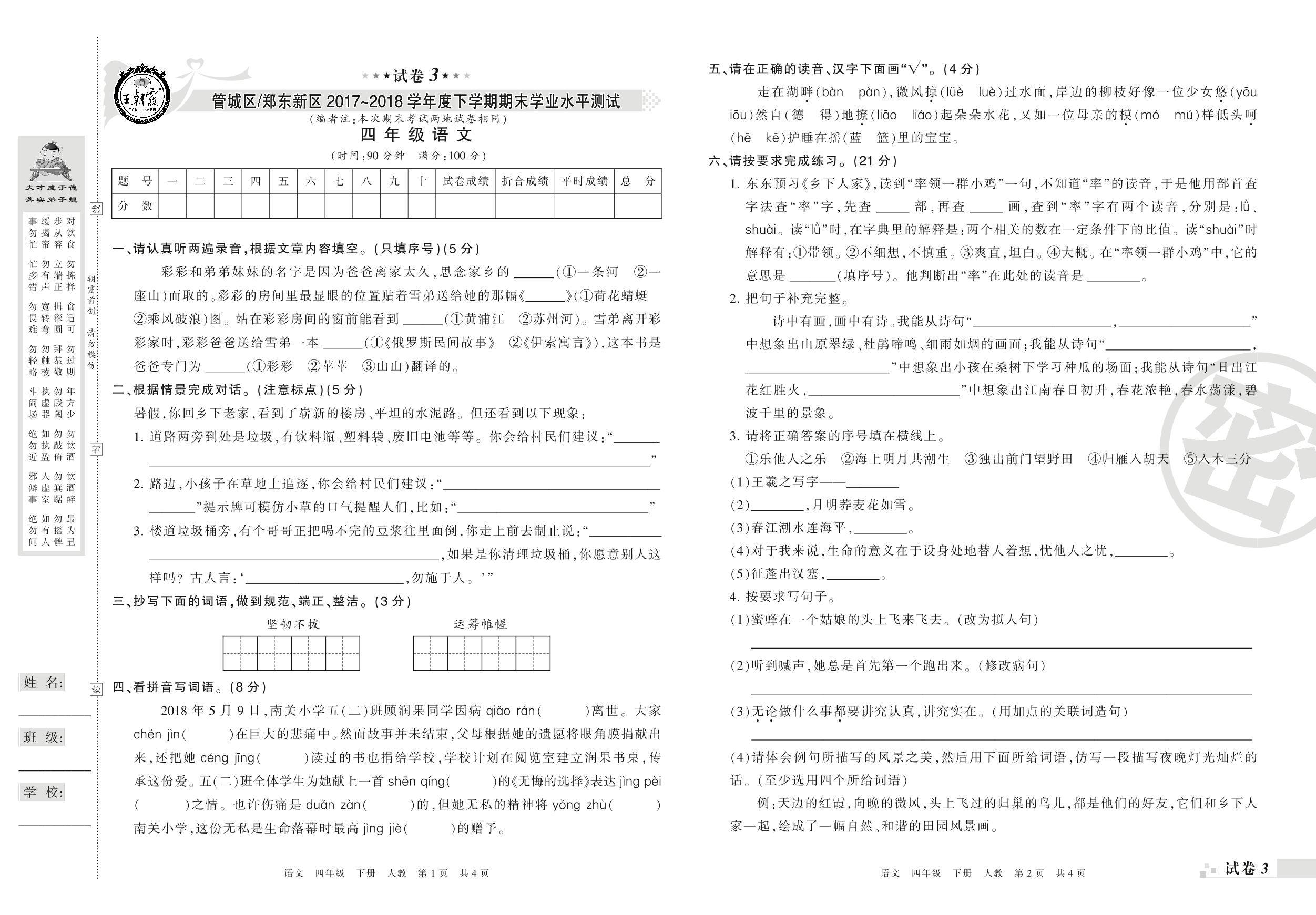 2017-2018学年第二学期郑州市管城区、郑东新区四年级语文试卷(人教版)【3】