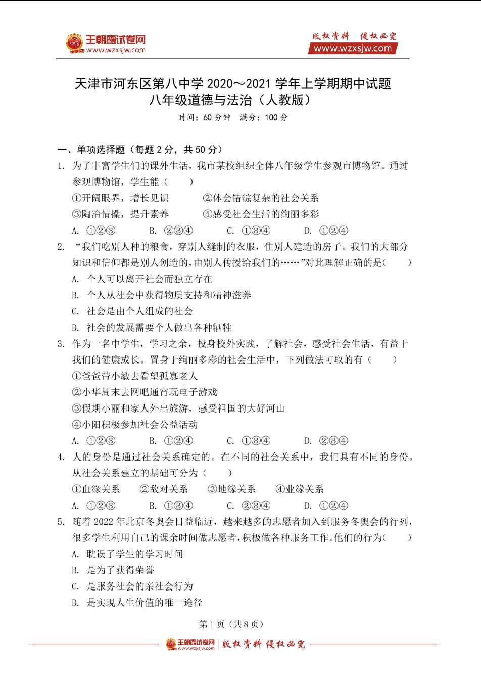 天津市河东区第八中学2020~2021学年上学期期中试题八年级道德与法治(人教版)