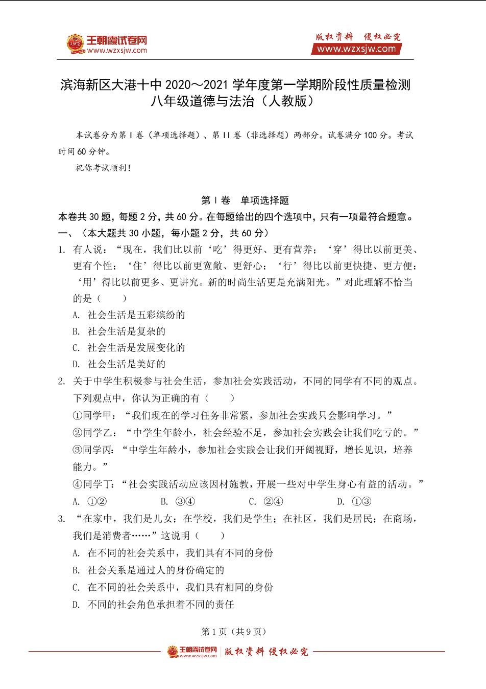天津市滨海新区大港十中2020~2021学年度第一学期阶段性质量检测八年级道德与法治(人教版)