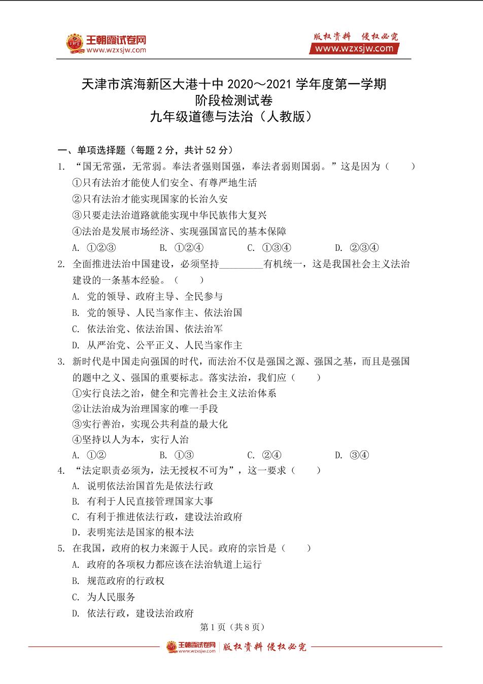 天津市滨海新区大港十中2020~2021学年度九年级第一学期阶段检测道德与法治试卷(人教版)