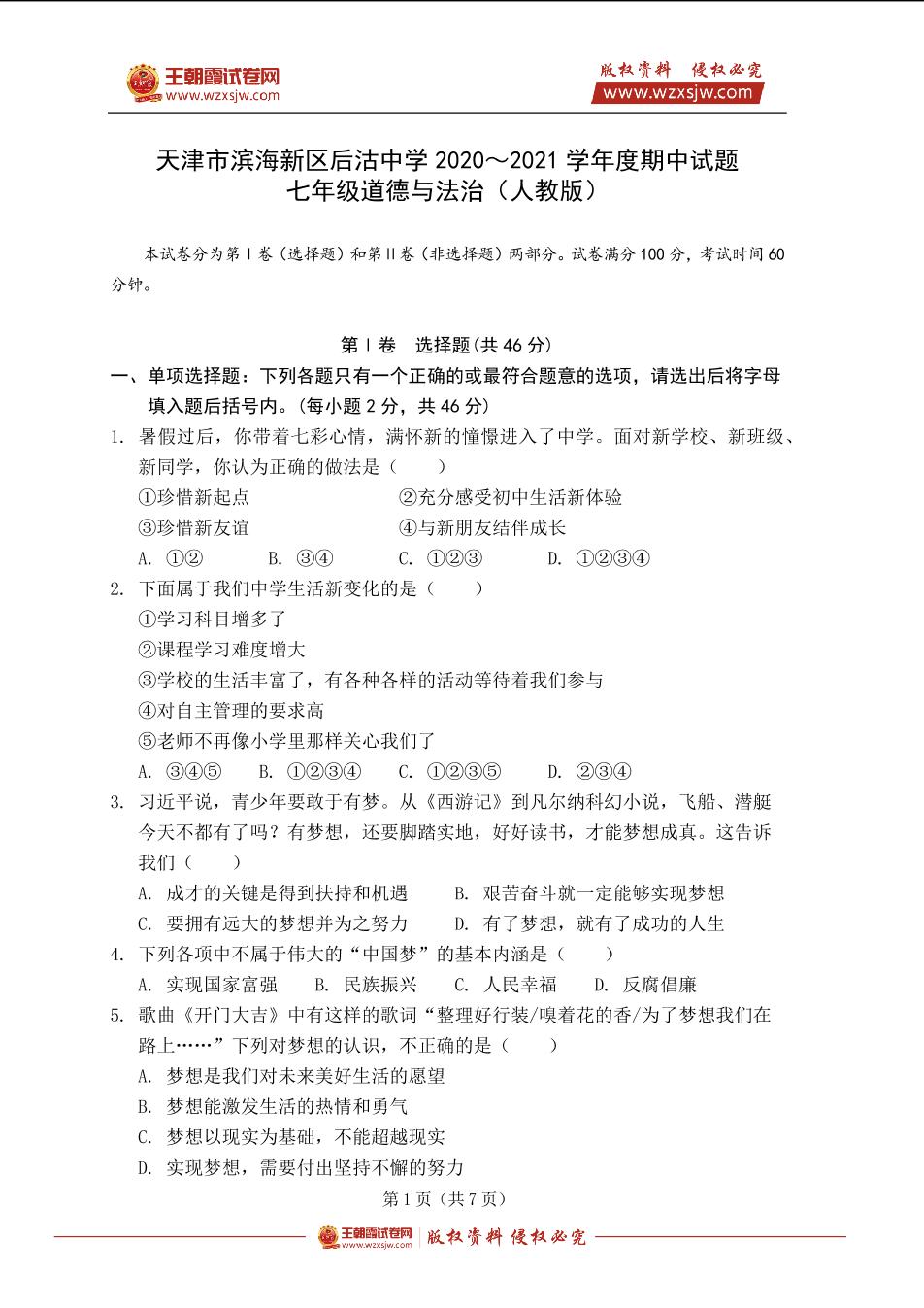 天津市滨海新区后沽中学2020~2021学年度七年级期中道德与法治试题(人教版)