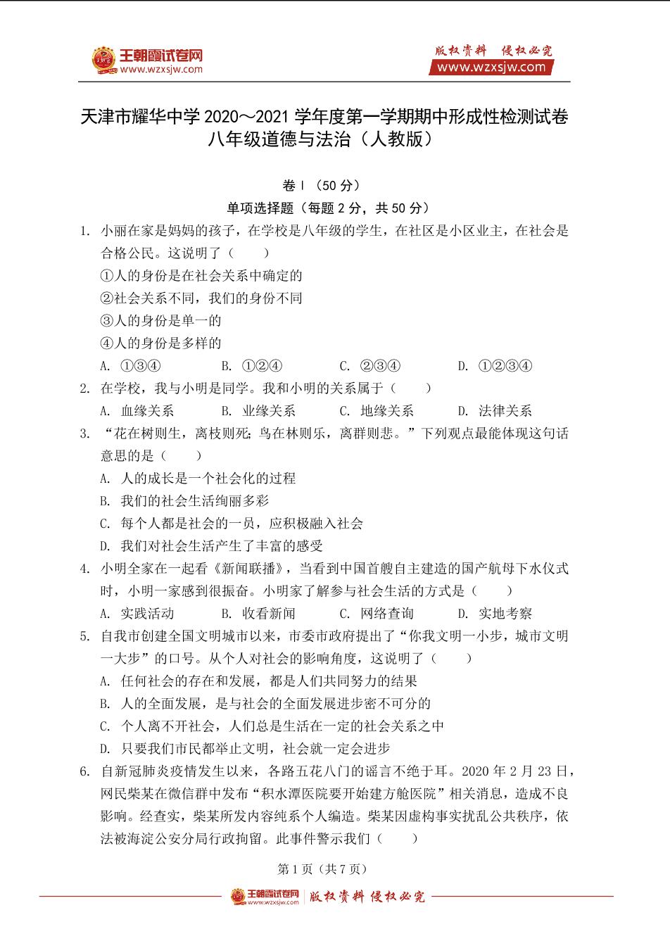 天津市耀华中学2020~2021学年度第一学期期中形成性检测试卷八年级道德与法治(人教版)