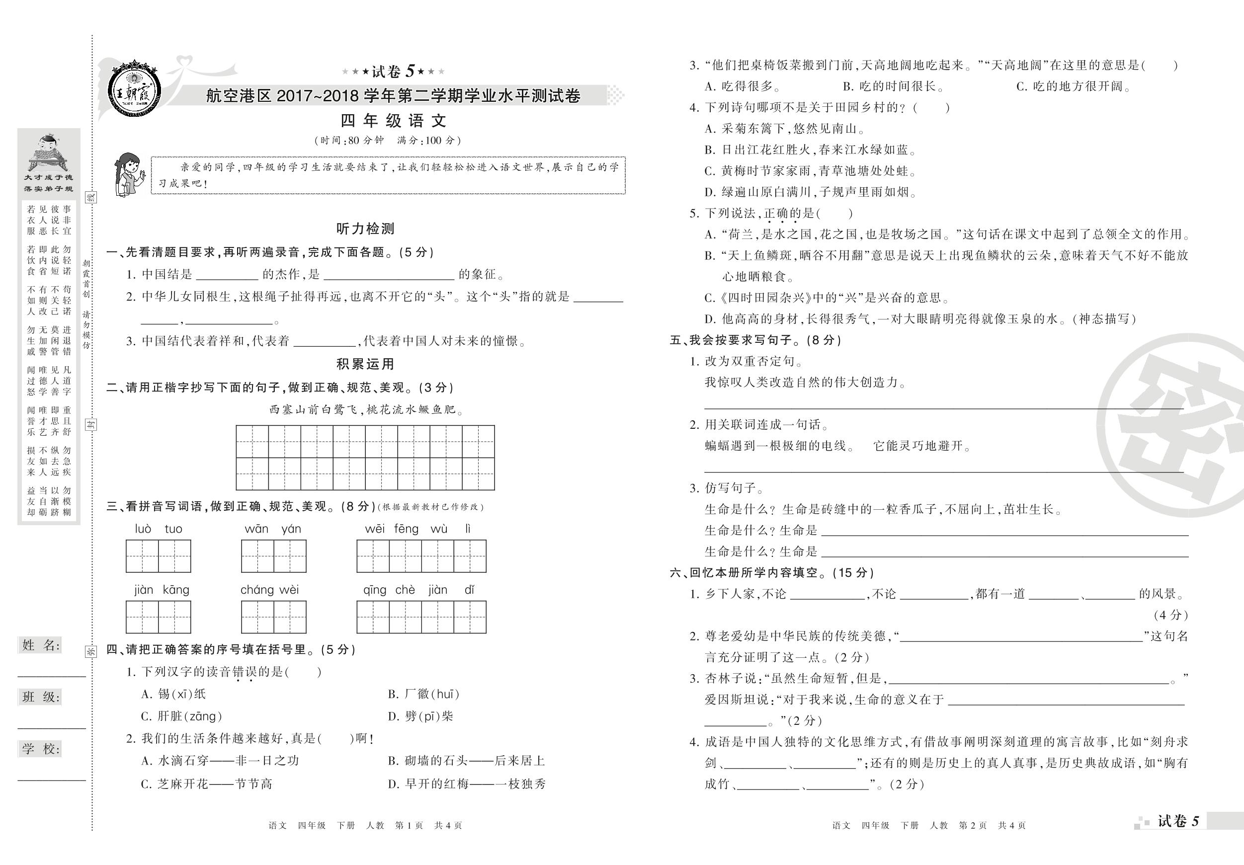 2017-2018学年第二学期郑州市航空港区四年级语文试卷(人教版)【5】