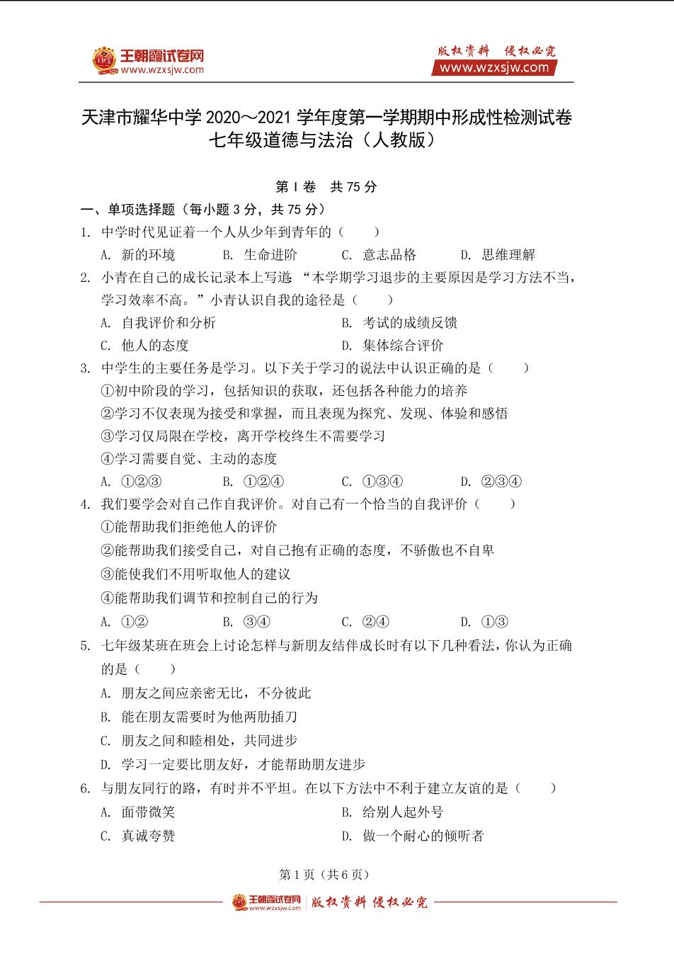 天津市耀华中学2020~2021学年度七年级第一学期期中形成性检测道德与法治试卷(人教版)