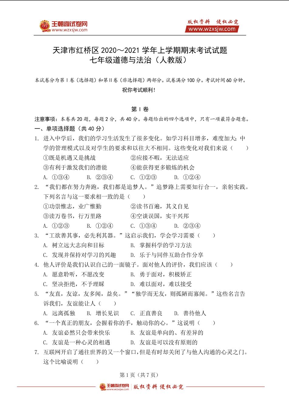 天津市红桥区2020~2021学年上学期期末考试试题七年级道德与法治(人教版)