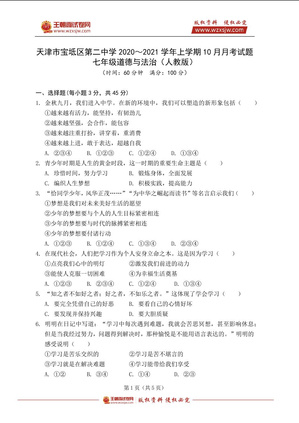 天津市宝坻区第二中学2020~2021学年七年级上学期10月月考道德与法治试题(人教版)