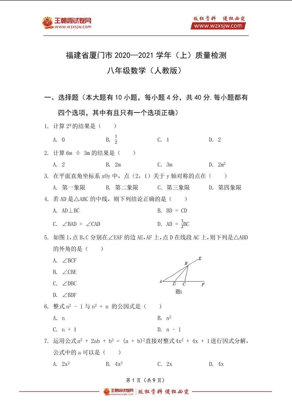 福建省厦门市2020—2021学年(上)质量检测八年级数学(人教版)