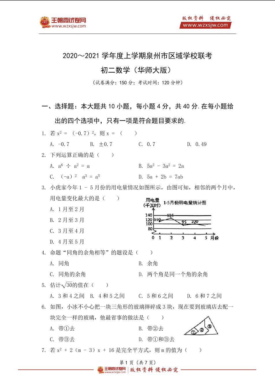 福建省泉州市区域学校2020-2021学年八年级第一学期数学期末联考试题(华师大版)