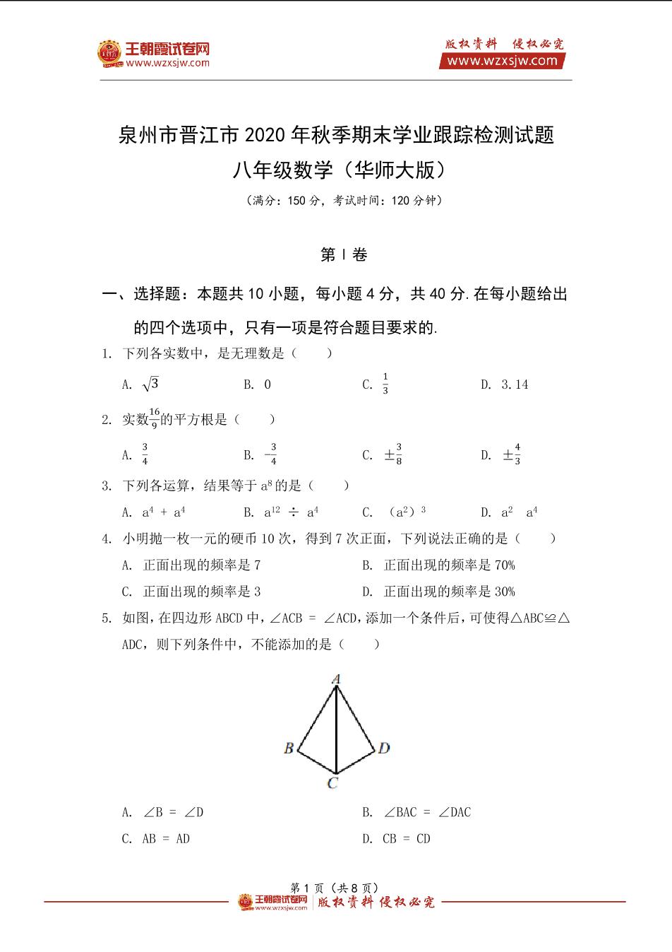 泉州市晋江市2020年秋季期末学业跟踪检测试题八年级数学(华师大版)