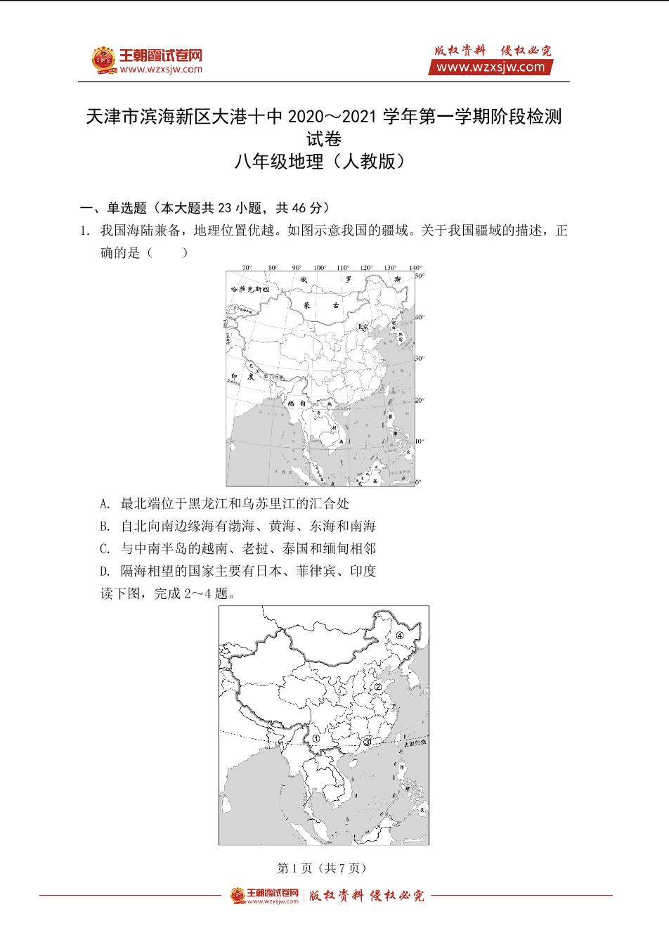 天津市滨海新区大港十中2020~2021学年第一学期阶段检测试卷八年级地理(人教版)