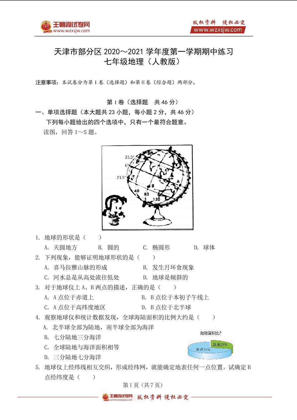 天津市部分区2020~2021学年七年级上学期期中地理试题(人教版)