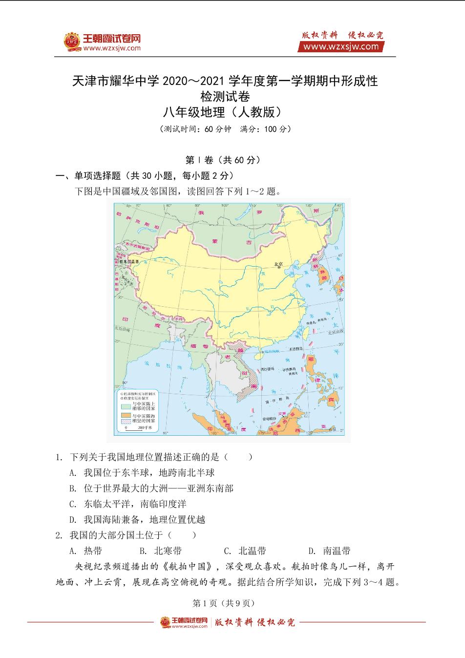 天津市耀华中学2020~2021学年八年级上学期期中地理试题(人教版)