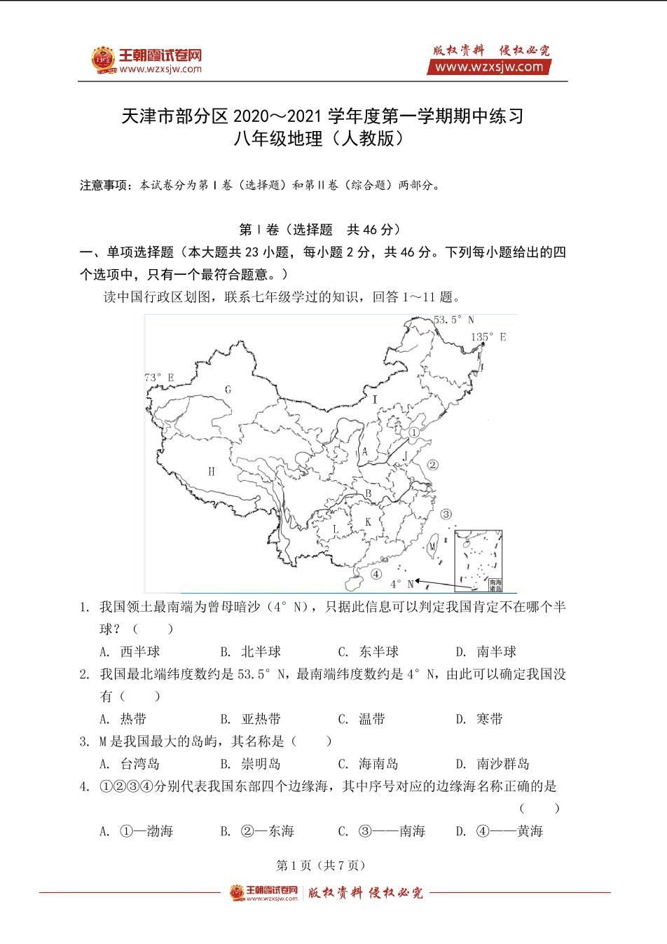 天津市部分区2020~2021学年度八年级第一学期期中地理练习(人教版)