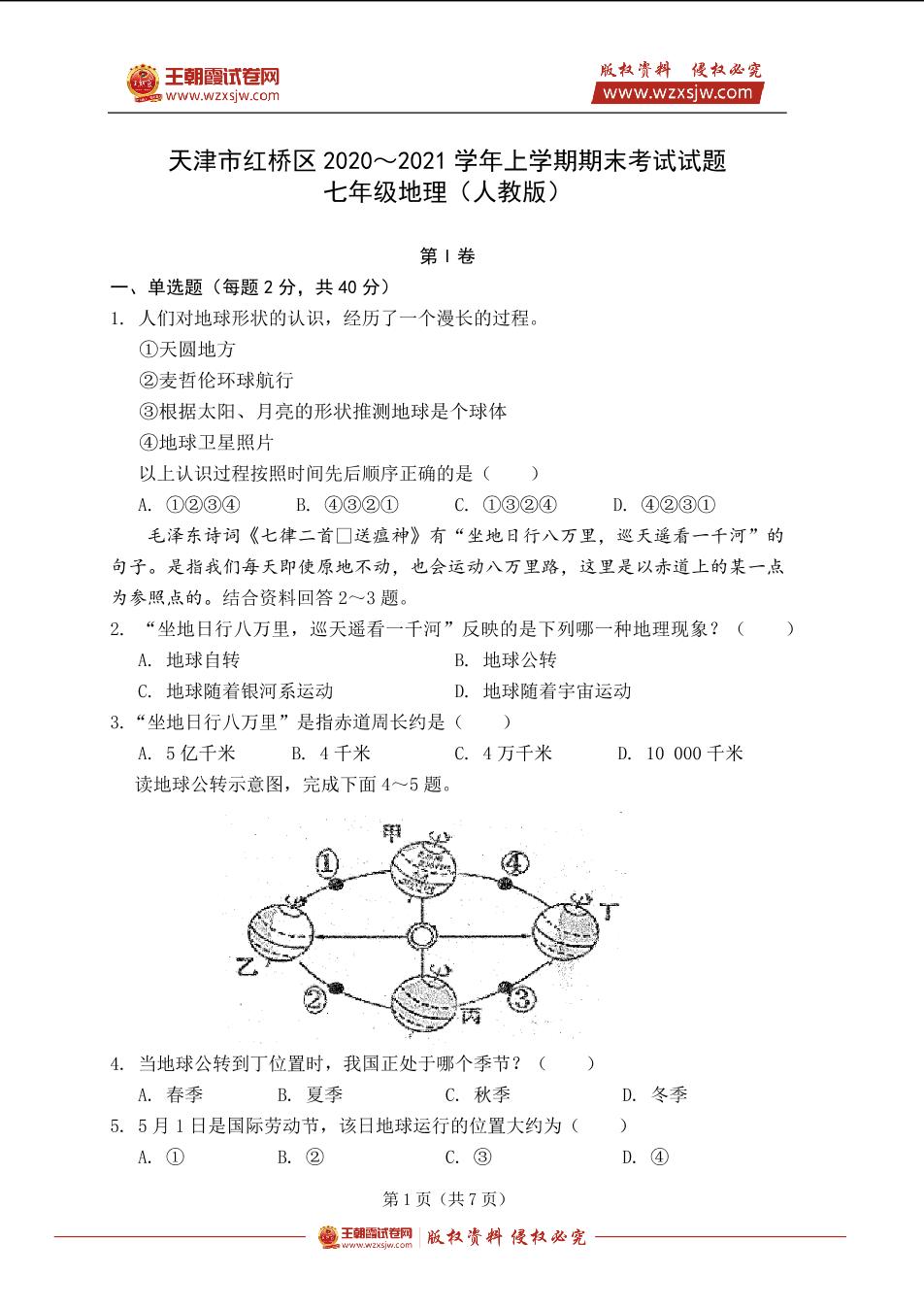 天津市红桥区2020~2021学年七年级上学期期末考试地理试题(人教版)
