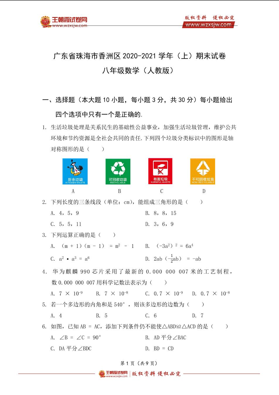 广东省珠海市香洲区2020-2021学年(上)期末试卷八年级数学(人教版)