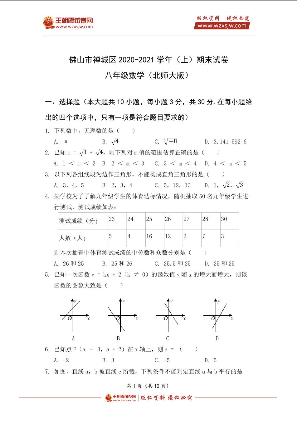 佛山市禅城区2020-2021学年上学期初中八年级期末考试数学试卷(北师大版)