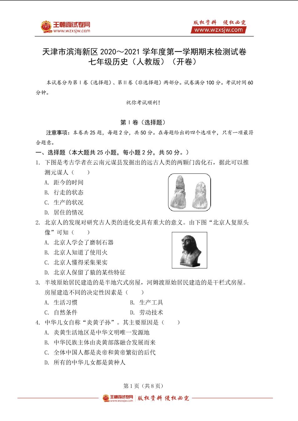 天津市滨海新区2020~2021学年度七年级第一学期期末历史检测试卷(人教版)