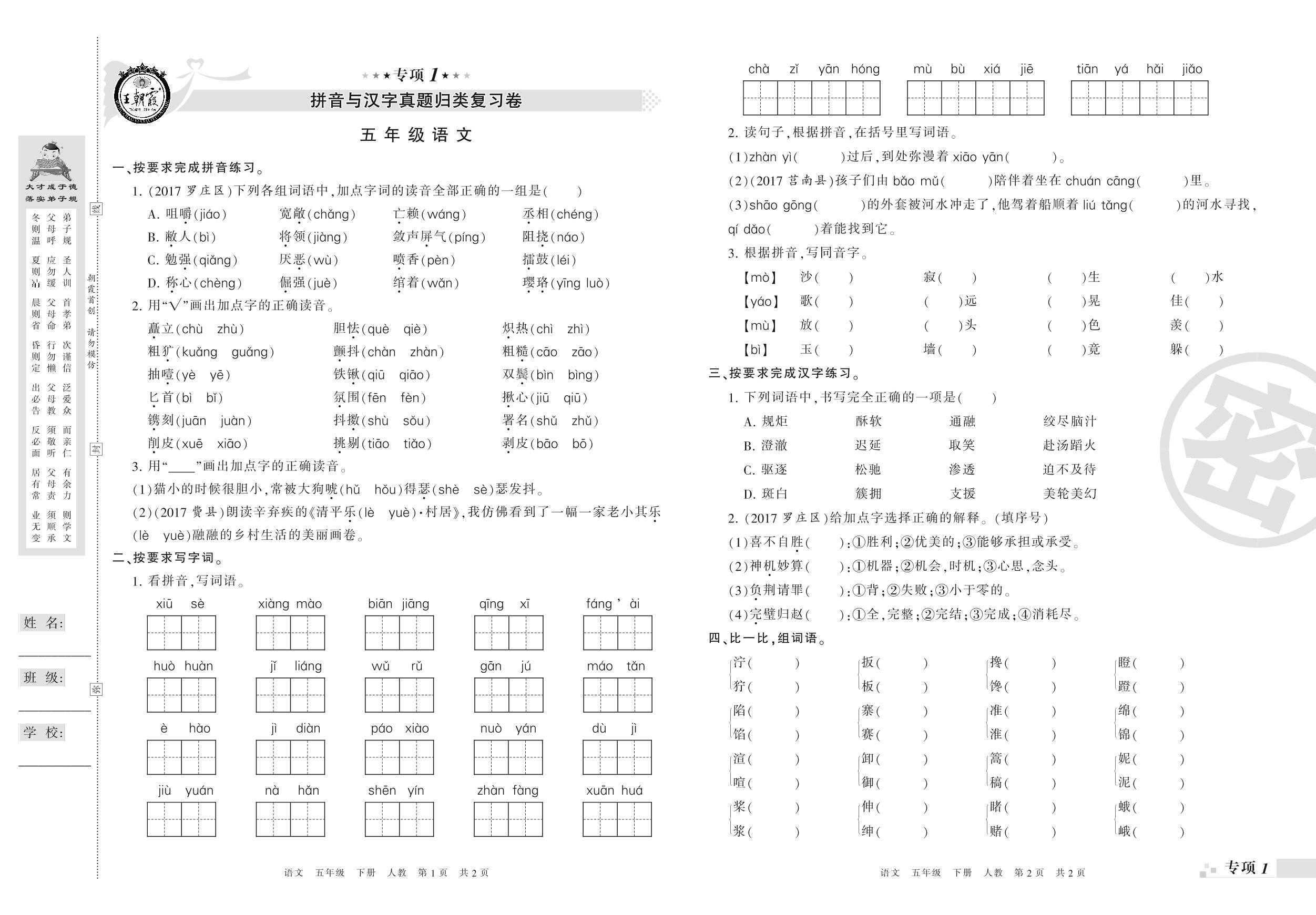 王朝霞期末专项卷——拼音与汉字、词语真题归类复习卷五年级下册语文(人教版)_R210801204738【0】