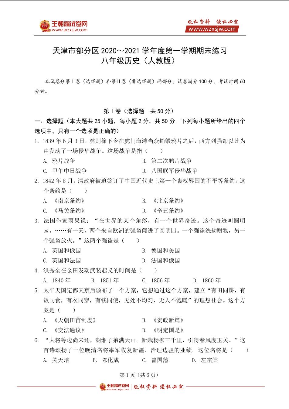 天津市部分区2020~2021学年度第一学期期末练习八年级历史(人教版)