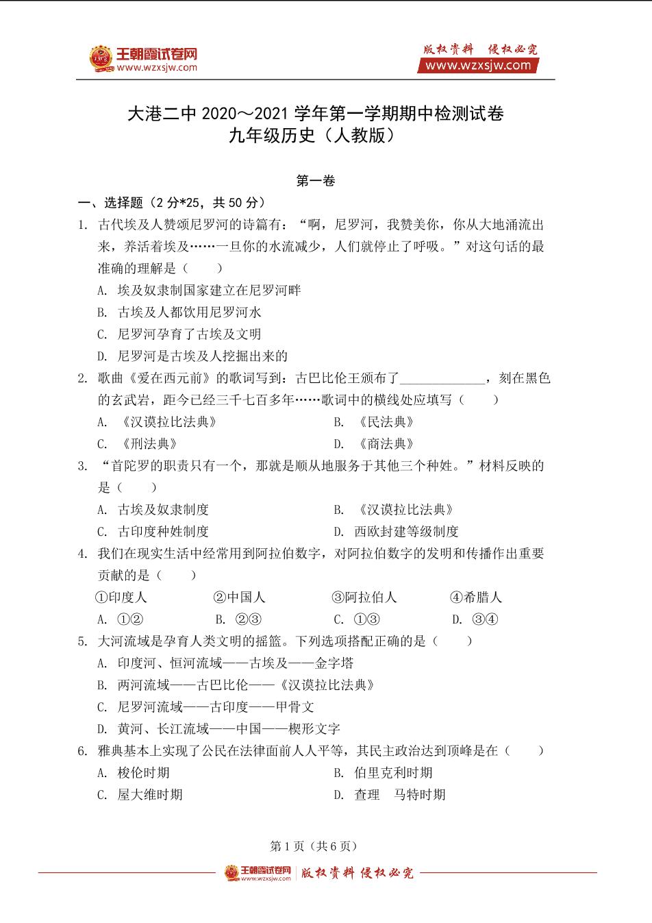 天津市滨海新区大港二中2020~2021学年第一学期九年级历史期中检测试卷(人教版)