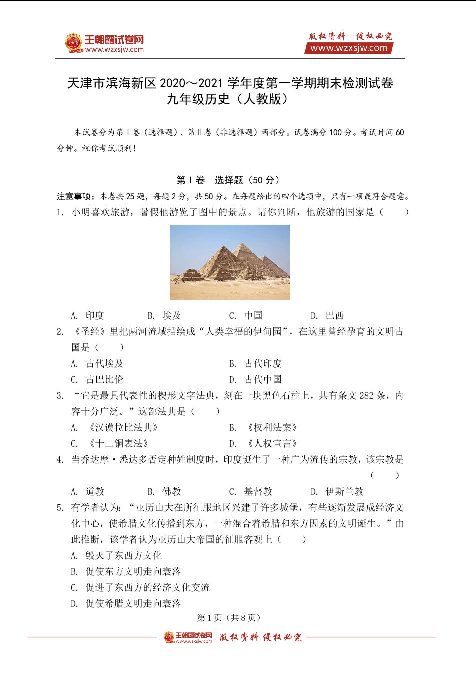 天津市滨海新区2020~2021学年度九年级第一学期期末检测历史试卷(人教版)
