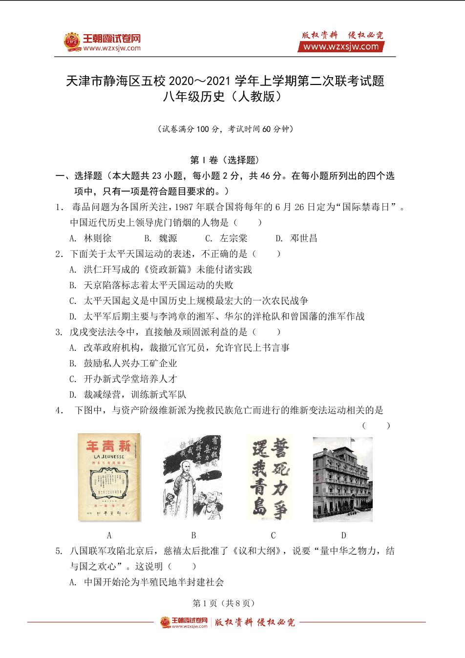 天津市静海区五校2020~2021学年度八年级上学期第二次联考历史试题(人教版)