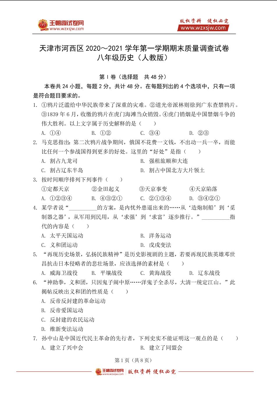 天津市河西区2020~2021学年第一学期八年级期末质量调查历史试卷(人教版)