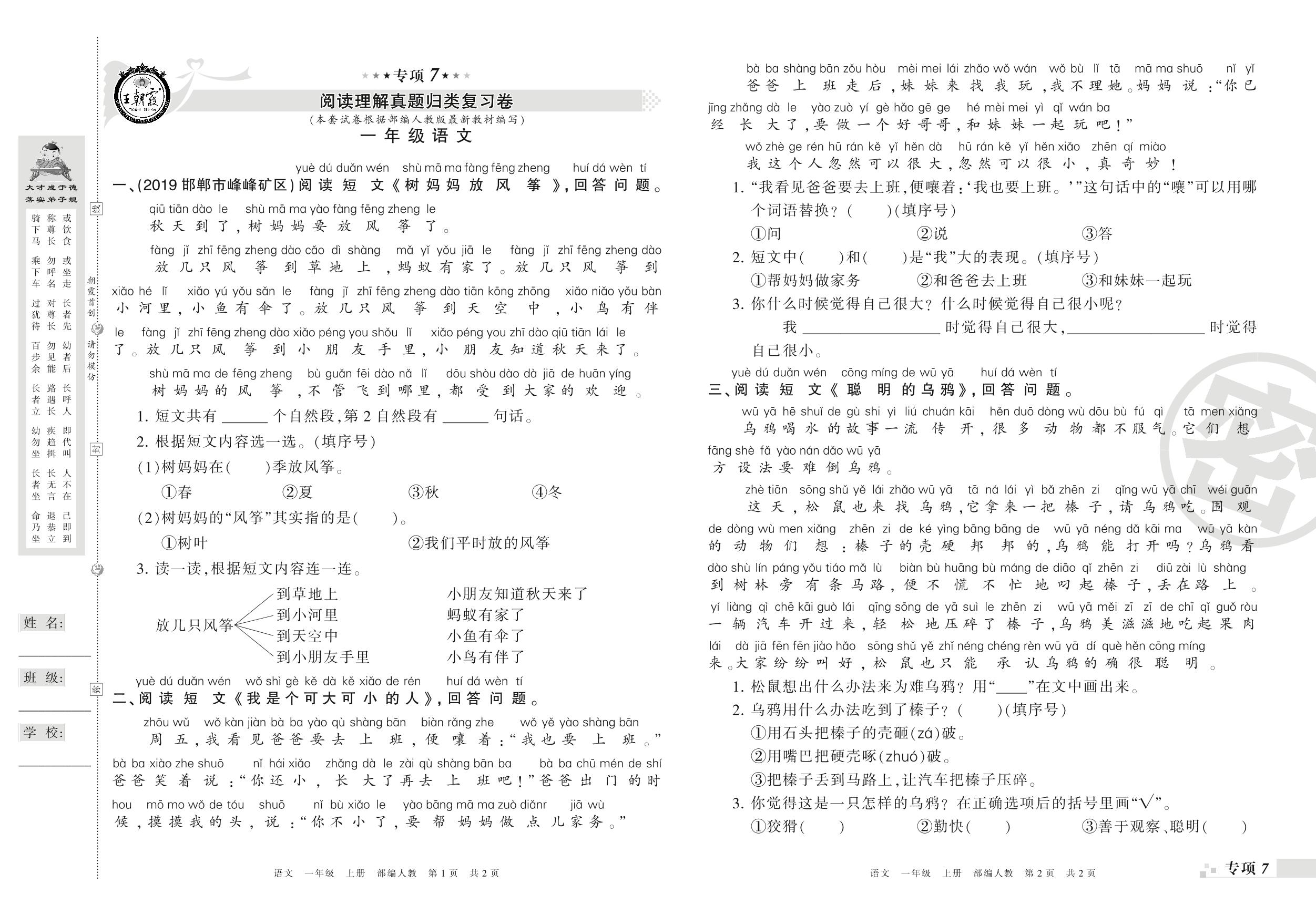 王朝霞期末专项卷——阅读理解、写话真题归类复习卷一年级上册语文(人教版)_R210731181739【0】